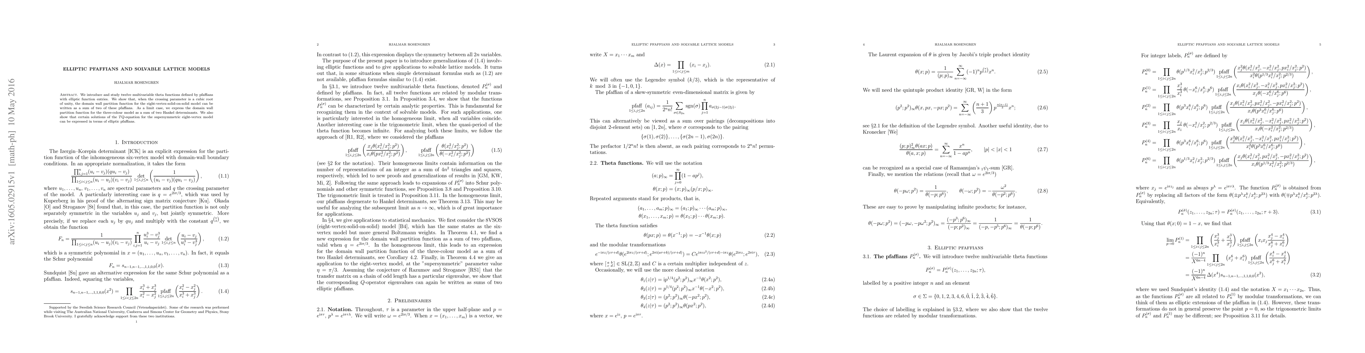 This paper explores twelve multivariable theta functions defined by elliptic pfaffians, demonstrating their connection to the eight-vertex-solid-on-solid model and the three-colour model through domain wall partition functions. It also links these functions to solutions of the TQ-equation for the supersymmetric eight-vertex model.
