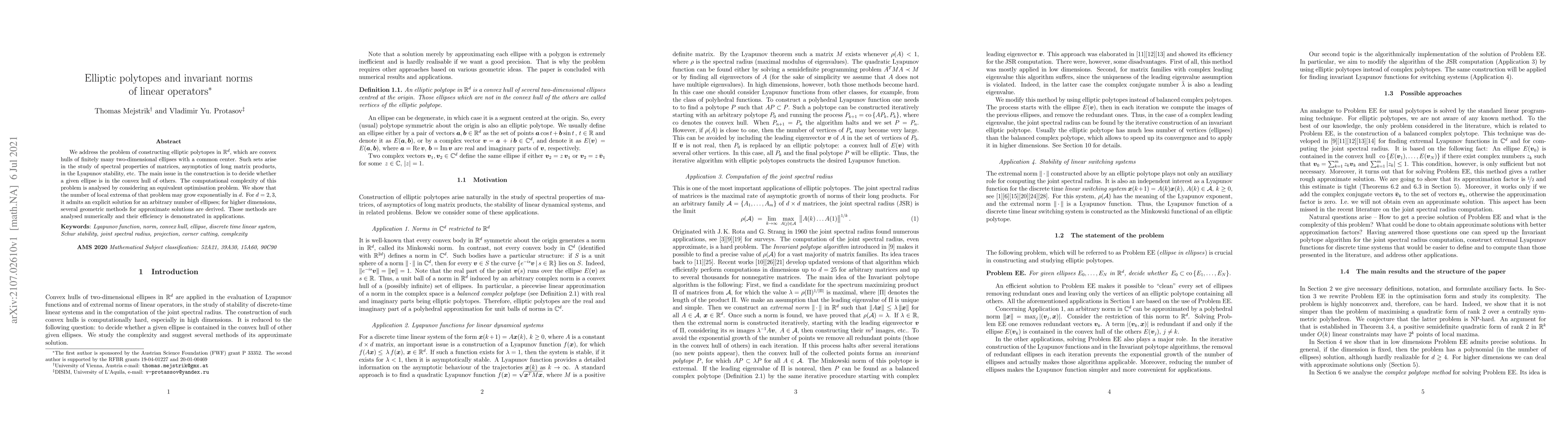 We address the problem of constructing elliptic polytopes in R^d, which are convex hulls of finitely many two-dimensional ellipses with a common center. Such sets arise in the study of spectral properties of matrices, asymptotics of long matrix products, in the Lyapunov stability, etc.. The main issue in the construction is to decide whether a given ellipse is in the convex hull of others. The computational complexity of this problem is analysed by considering an equivalent optimisation problem. We show that the number of local extrema of that problem may grow exponentially in d. For d=2,3, it admits an explicit solution for an arbitrary number of ellipses; for higher dimensions, several geometric methods for approximate solutions are derived. Those methods are analysed numerically and their efficiency is demonstrated in applications.