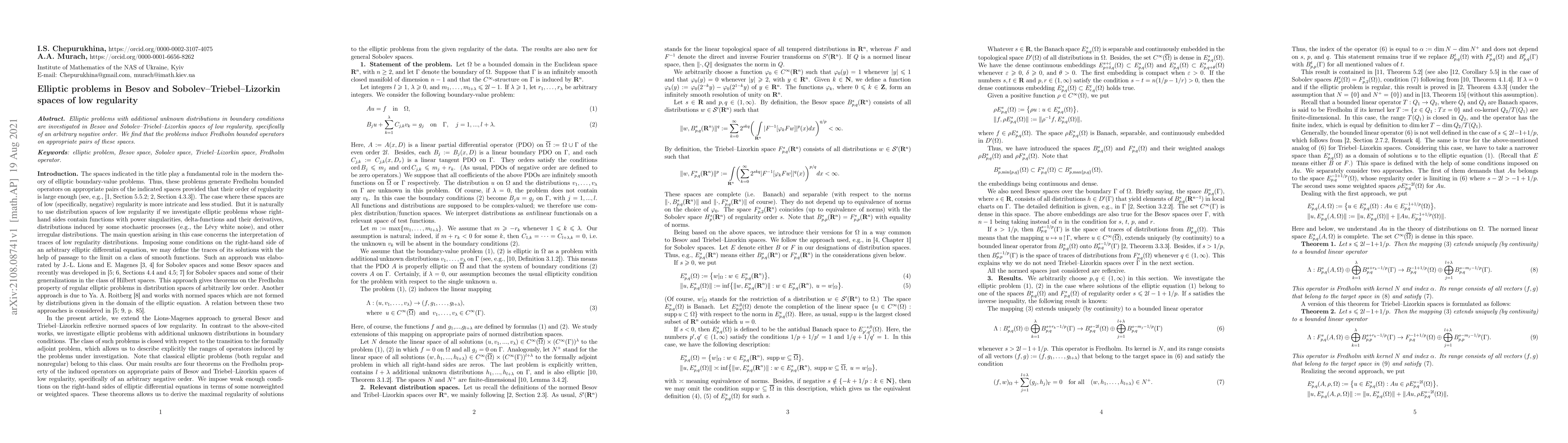This paper investigates elliptic problems with boundary conditions involving unknown distributions in Besov and Sobolev-Triebel-Lizorkin spaces of low regularity, specifically negative order. It demonstrates that these problems result in Fredholm bounded operators on suitable pairs of these function spaces.