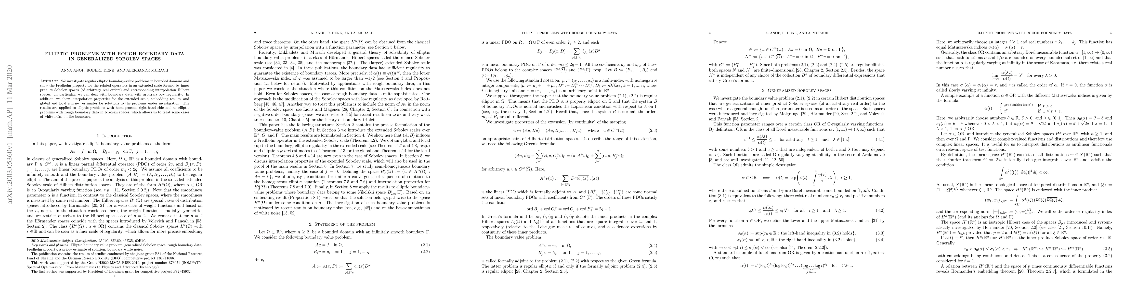 We investigate regular elliptic boundary-value problems in bounded domains and show the Fredholm property for the related operators in an extended scale formed by inner product Sobolev spaces (of arbitrary real orders) and corresponding interpolation Hilbert spaces. In particular, we can deal with boundary data with arbitrary low regularity. In addition, we show interpolation properties for the extended scale, embedding results, and global and local a priori estimates for solutions to the problems under investigation. The results are applied to elliptic problems with homogeneous right-hand side and to elliptic problems with rough boundary data in Nikoskii spaces, which allows us to treat some cases of white noise on the boundary.