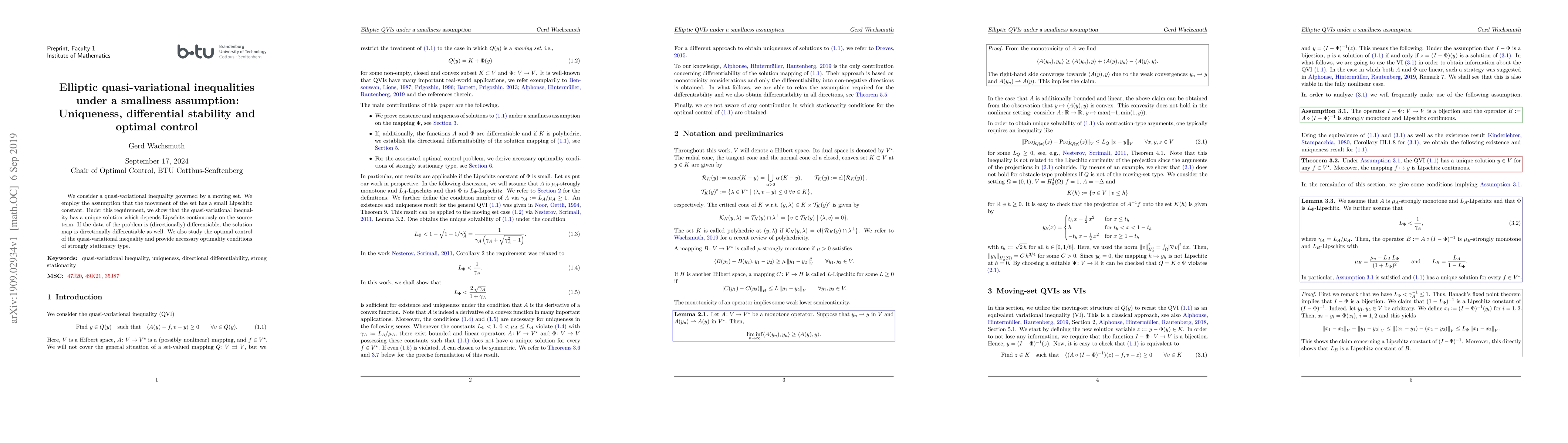This paper investigates elliptic quasi-variational inequalities under a small Lipschitz constant assumption for the moving set. It demonstrates uniqueness and Lipschitz-continuous stability of the solution, and discusses directional differentiability when data is differentiable. It also explores optimal control conditions for the inequality.