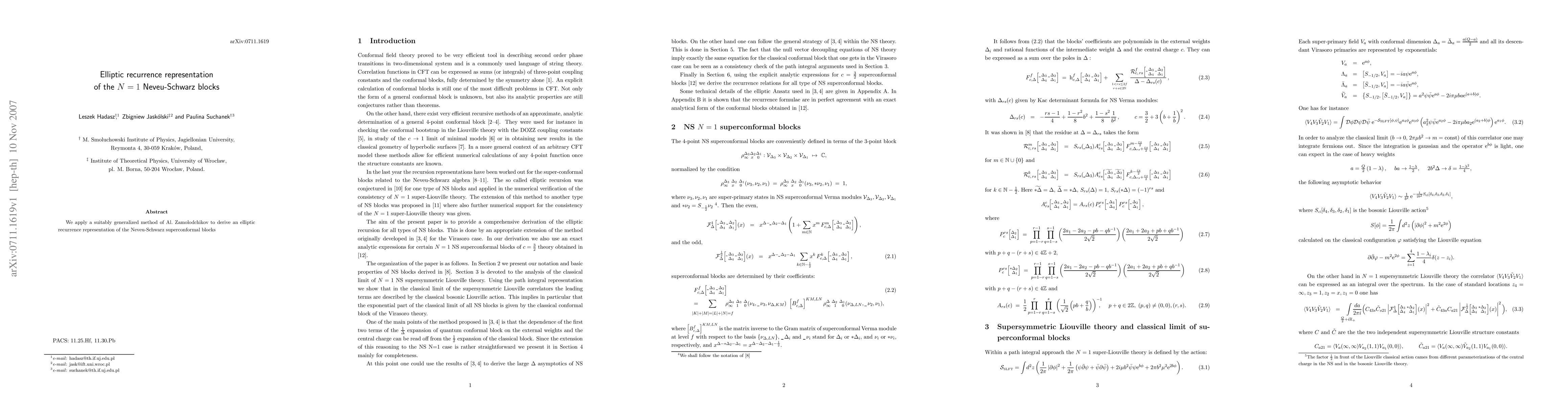 Summary: This paper uses a generalized method to derive an elliptic recurrence representation for N=1 Neveu-Schwarz superconformal blocks, extending Al. Zamolodchikov's approach. The result provides a new framework for understanding these blocks.