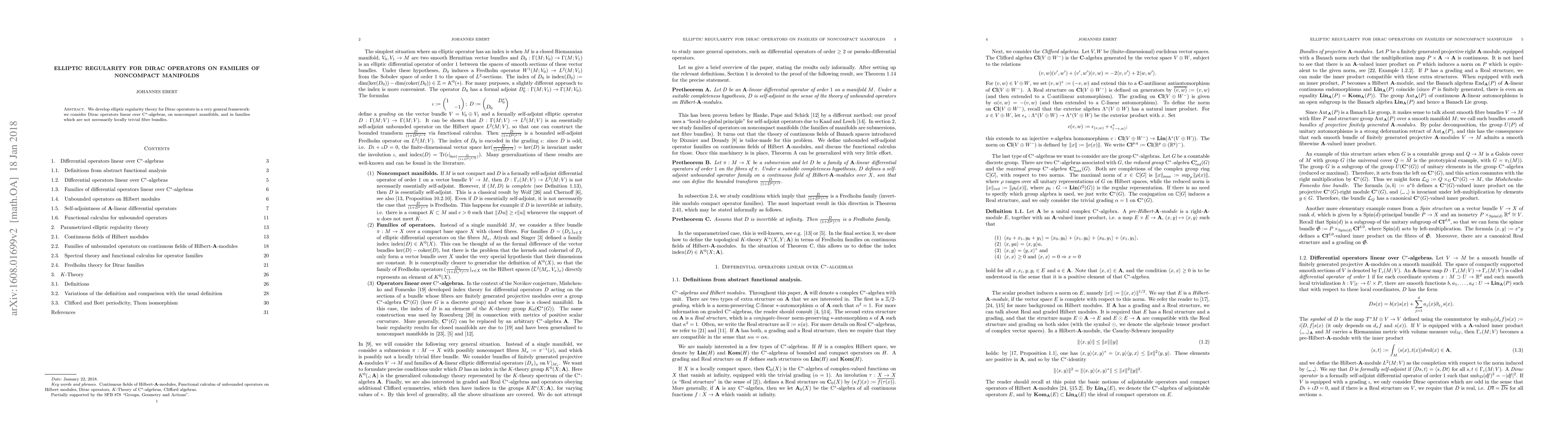 We develop elliptic regularity theory for Dirac operators in a very general framework: we consider Dirac operators linear over $C^*$-algebras, on noncompact manifolds, and in families which are not necessarily locally trivial fibre bundles.