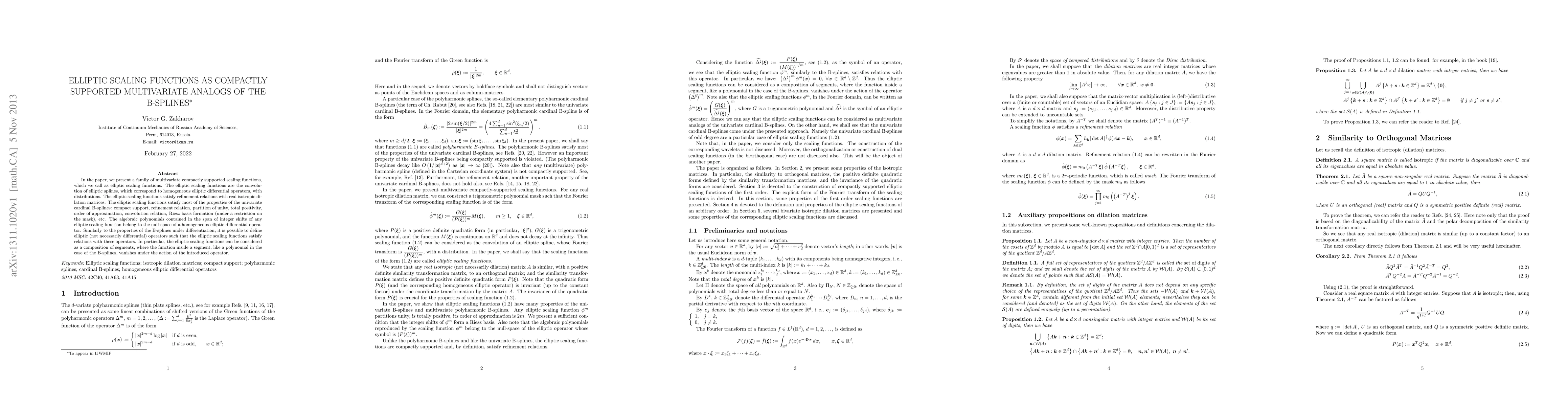 In the paper, we present a family of multivariate compactly supported scaling functions, which we call as elliptic scaling functions. The elliptic scaling functions are the convolution of elliptic splines, which correspond to homogeneous elliptic differential operators, with distributions. The elliptic scaling functions satisfy refinement relations with real isotropic dilation matrices. The elliptic scaling functions satisfy most of the properties of the univariate cardinal B-splines: compact support, refinement relation, partition of unity, total positivity, order of approximation, convolution relation, Riesz basis formation (under a restriction on the mask), etc. The algebraic polynomials contained in the span of integer shifts of any elliptic scaling function belong to the null-space of a homogeneous elliptic differential operator. Similarly to the properties of the B-splines under differentiation, it is possible to define elliptic (not necessarily differential) operators such that the elliptic scaling functions satisfy relations with these operators. In particular, the elliptic scaling functions can be considered as a composition of segments, where the function inside a segment, like a polynomial in the case of the B-splines, vanishes under the action of the introduced operator.
