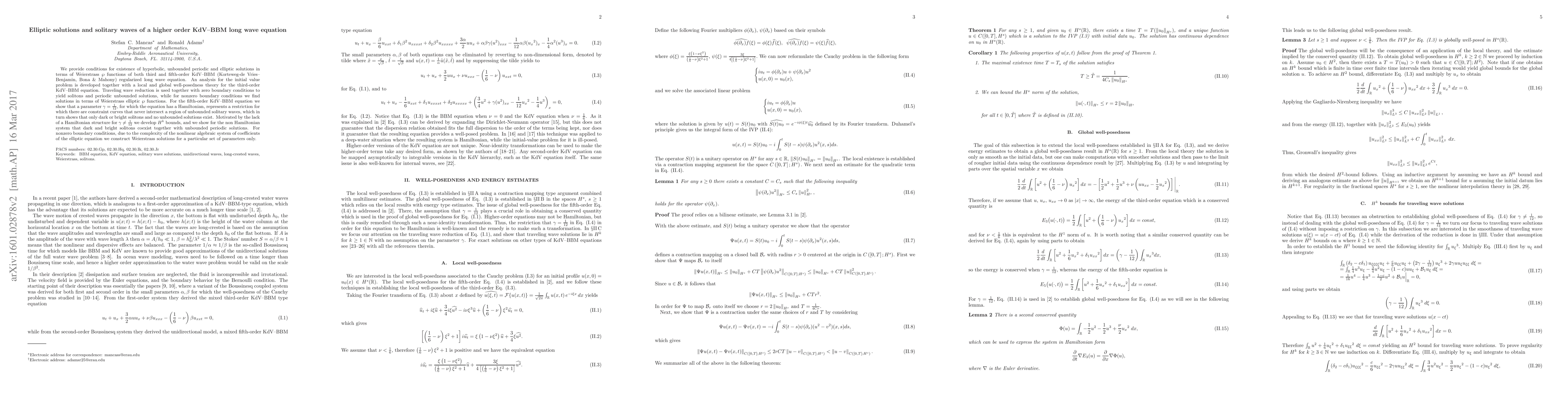 We provide conditions for existence of hyperbolic, unbounded periodic and elliptic solutions in terms of Weierstrass $\wp$ functions of both third and fifth-order KdV--BBM (Korteweg-de Vries--Benjamin, Bona \& Mahony) regularized long wave equation. An analysis for the initial value problem is developed together with a local and global well-posedness theory for the third-order KdV--BBM equation. Traveling wave reduction is used together with zero boundary conditions to yield solitons and periodic unbounded solutions, while for nonzero boundary conditions we find solutions in terms of Weierstrass elliptic $\wp$ functions. For the fifth-order KdV--BBM equation we show that a parameter $\gamma=\frac {1}{12}$, for which the equation has a Hamiltonian, represents a restriction for which there are constraint curves that never intersect a region of unbounded solitary waves, which in turn shows that only dark or bright solitons and no unbounded solutions exist. Motivated by the lack of a Hamiltonian structure for $\gamma\neq\frac{1}{12}$ we develop $H^k$ bounds, and we show for the non Hamiltonian system that dark and bright solitons coexist together with unbounded periodic solutions. For nonzero boundary conditions, due to the complexity of the nonlinear algebraic system of coefficients of the elliptic equation we construct Weierstrass solutions for a particular set of parameters only.