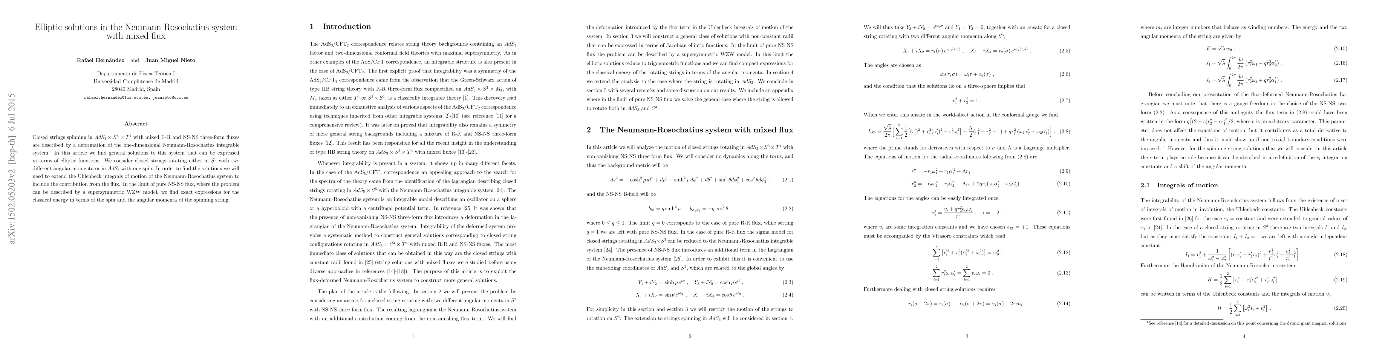 This paper investigates elliptic solutions for closed strings in the Neumann-Rosochatius system under mixed R-R and NS-NS fluxes, finding general solutions expressed in terms of elliptic functions. It extends Uhlenbeck integrals to include flux contributions and derives exact classical energy expressions for strings in supersymmetric WZW models.