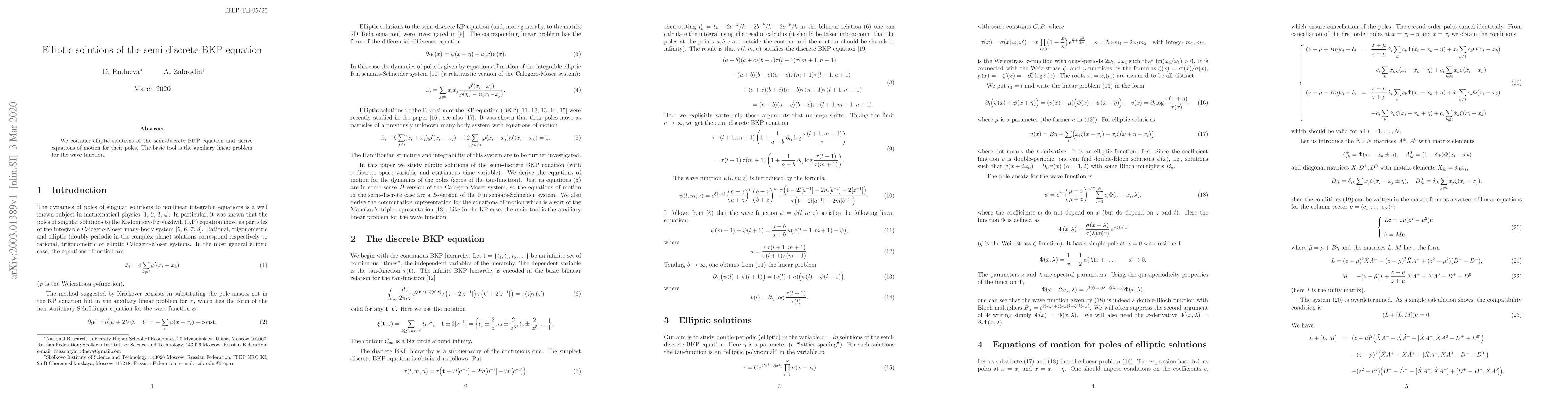 Summary: This paper explores elliptic solutions of the semi-discrete BKP equation, deriving equations of motion for their poles using the auxiliary linear problem associated with the wave function. The study focuses on the behavior and properties of these solutions.