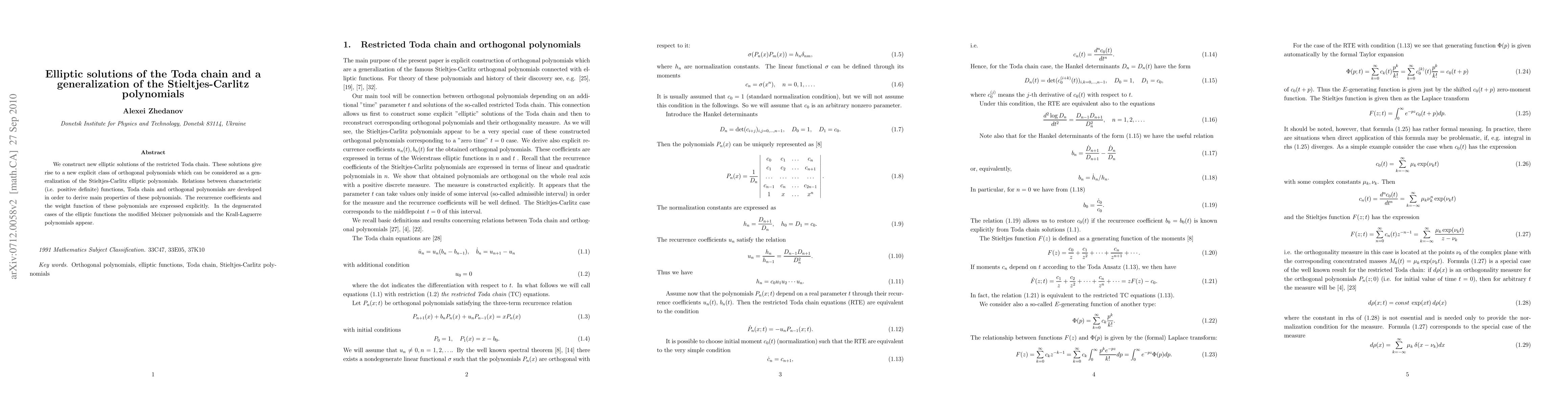 This paper constructs new elliptic solutions for the restricted Toda chain, leading to a novel class of orthogonal polynomials that generalize the Stieltjes-Carlitz elliptic polynomials. It explores the connections between characteristic functions, the Toda chain, and these polynomials, providing explicit expressions for their recurrence coefficients and weight functions.