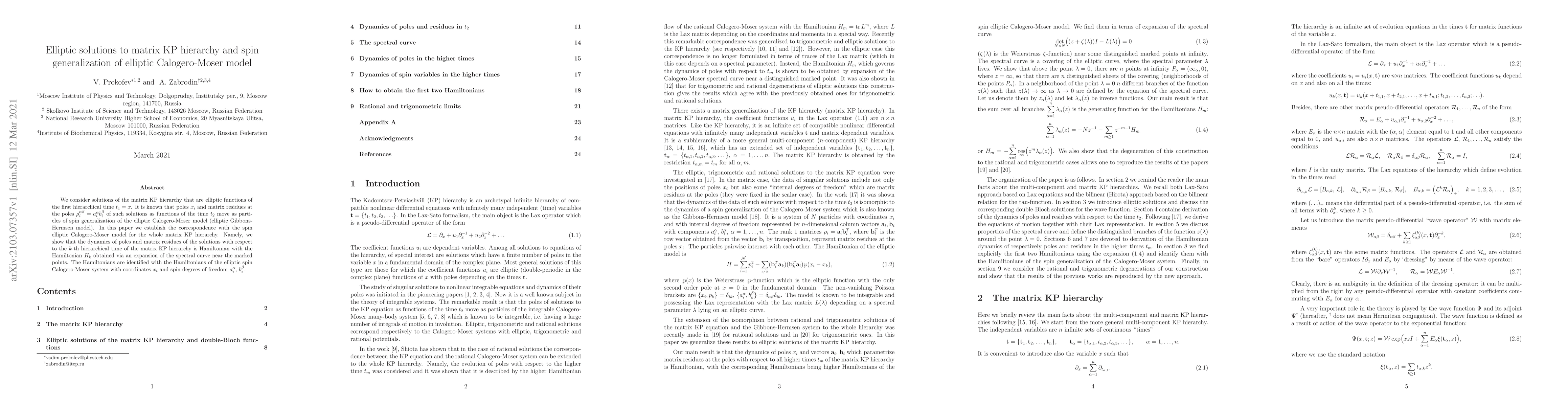 This paper establishes a correspondence between solutions of the matrix KP hierarchy that are elliptic functions of the first hierarchical time and the spin generalization of the elliptic Calogero-Moser model, demonstrating that their dynamics are Hamiltonian with identified Hamiltonians.