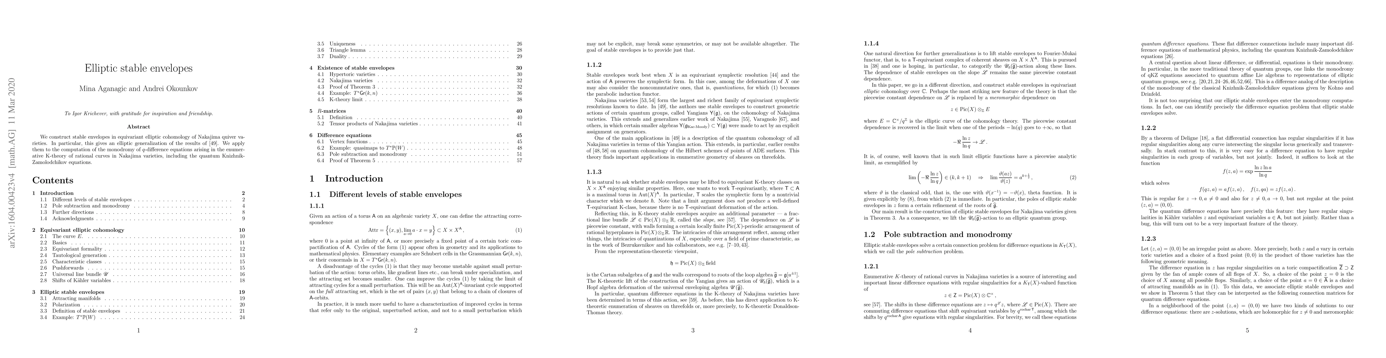 We construct stable envelopes in equivariant elliptic cohomology of Nakajima quiver varieties. In particular, this gives an elliptic generalization of the results of arXiv:1211.1287. We apply them to the computation of the monodromy of $q$-difference equations arising the enumerative K-theory of rational curves in Nakajima varieties, including the quantum Knizhnik-Zamolodchikov equations.
