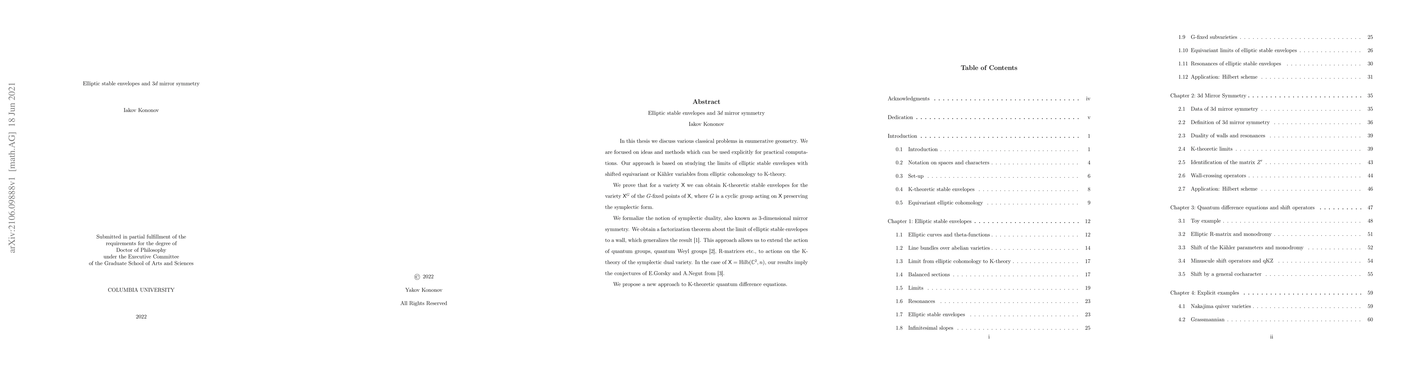 In this thesis we discuss various classical problems in enumerative geometry. We are focused on ideas and methods which can be used explicitly for practical computations. Our approach is based on studying the limits of elliptic stable envelopes with shifted equivariant or Kahler variables from elliptic cohomology to K-theory. We prove that for a variety X we can obtain K-theoretic stable envelopes for the variety X^G of the G-fixed points of X, where G is a cyclic group acting on X preserving the symplectic form. We formalize the notion of symplectic duality, also known as 3-dimensional mirror symmetry. We obtain a factorization theorem about the limit of elliptic stable envelopes to a wall, which generalizes the result of M.Aganagic and A.Okounkov. This approach allows us to extend the action of quantum groups, quantum Weyl groups, R-matrices etc., to actions on the K-theory of the symplectic dual variety. In the case of the Hilbert scheme of points in plane, our results imply the conjectures of E.Gorsky and A.Negut. We propose a new approach to K-theoretic quantum difference equations.
