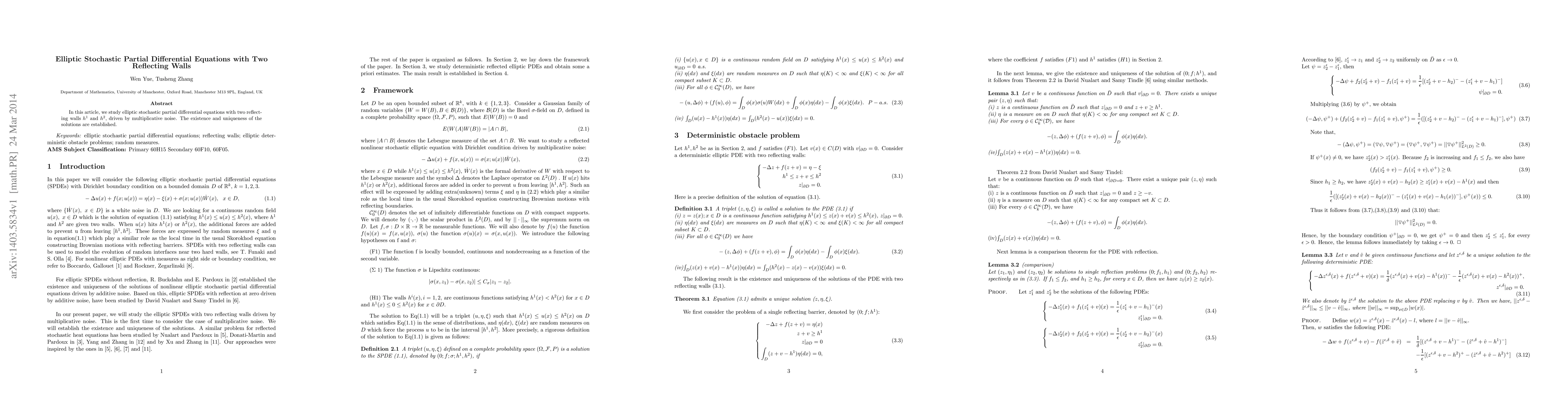 Summary: This paper investigates elliptic stochastic partial differential equations influenced by multiplicative noise and constrained by two reflecting walls, h1 and h2, establishing the existence and uniqueness of solutions.
