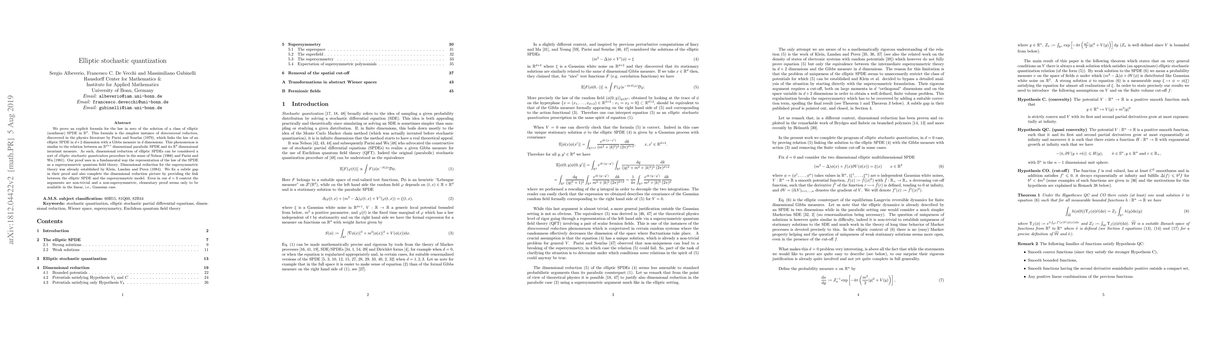We prove an explicit formula for the law in zero of the solution of a class of elliptic SPDE in $\mathbb{R}^2$. This formula is the simplest instance of dimensional reduction, discovered in the physics literature by Parisi and Sourlas (1979), which links the law of an elliptic SPDE in $d + 2$ dimension with a Gibbs measure in $d$ dimensions. This phenomenon is similar to the relation between an $\mathbb{R}^{d + 1}$ dimensional parabolic SPDE and its $\mathbb{R}^d$ dimensional invariant measure. As such, dimensional reduction of elliptic SPDEs can be considered a sort of elliptic stochastic quantisation procedure in the sense of Nelson (1966) and Parisi and Wu (1981). Our proof uses in a fundamental way the representation of the law of the SPDE as a supersymmetric quantum field theory. Dimensional reduction for the supersymmetric theory was already established by Klein et al. (1984). We fix a subtle gap in their proof and also complete the dimensional reduction picture by providing the link between the elliptic SPDE and the supersymmetric model. Even in our $d = 0$ context the arguments are non-trivial and a non-supersymmetric, elementary proof seems only to be available in the Gaussian case.