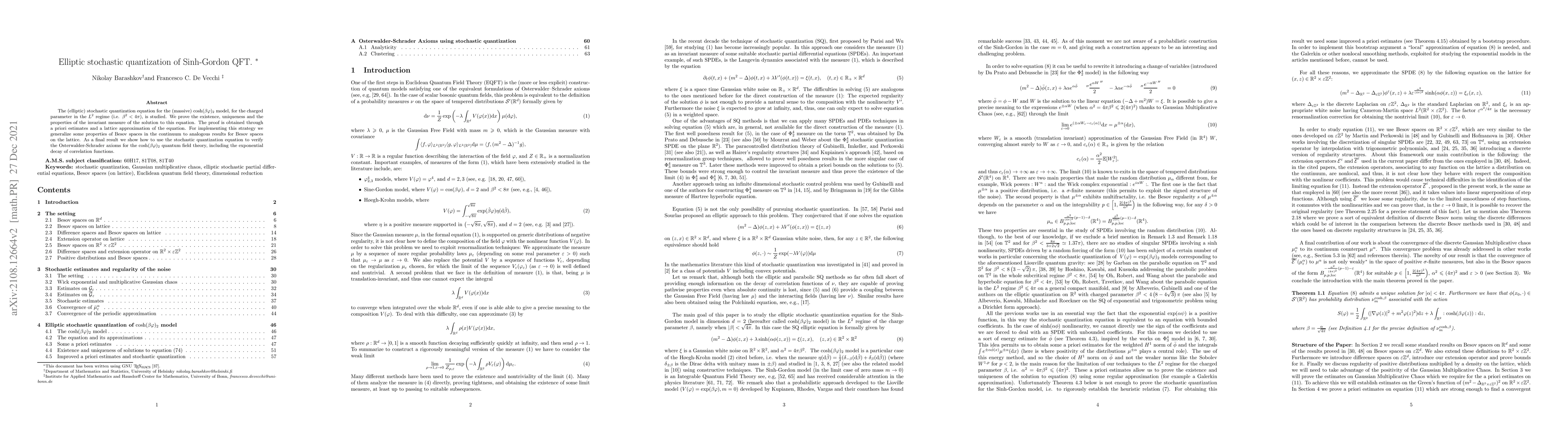The (elliptic) stochastic quantization equation for the (massive) $\cosh(\beta \varphi)_2$ model, for the charged parameter in the $L^2$ regime (i.e. $\beta^2 < 4 \pi$), is studied. We prove the existence, uniqueness and the properties of the invariant measure of the solution to this equation. The proof is obtained through a priori estimates and a lattice approximation of the equation. For implementing this strategy we generalize some properties of Besov spaces in the continuum to analogous results for Besov spaces on the lattice. As a final result we show how to use the stochastic quantization equation to verify the Osterwalder-Schrader axioms for the $\cosh (\beta \varphi)_2$ quantum field theory, including the exponential decay of correlation functions.