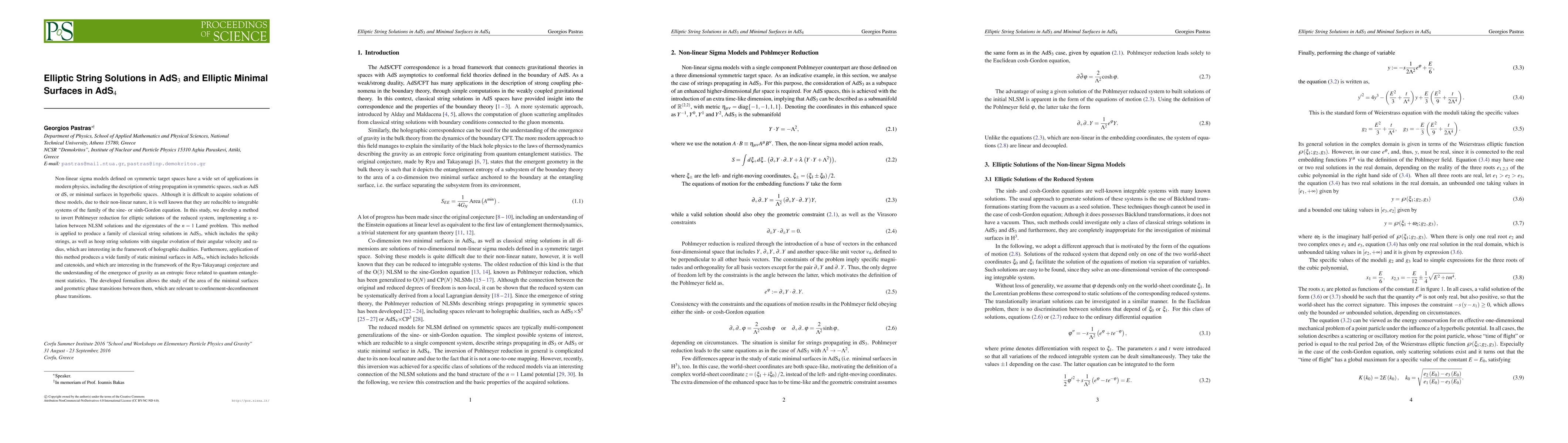 Non-linear sigma models defined on symmetric target spaces have a wide set of applications in modern physics, including the description of string propagation in symmetric spaces, such as AdS or dS, or minimal surfaces in hyperbolic spaces. Although it is difficult to acquire solutions of these models, due to their non-linear nature, it is well known that they are reducible to integrable systems of the family of the sine- or sinh-Gordon equation. In this study, we develop a method to invert Pohlmeyer reduction for elliptic solutions of the reduced system, implementing a relation between NLSM solutions and the eigenstates of the n = 1 Lame problem. This method is applied to produce a family of classical string solutions in AdS(3), which includes the spiky strings, as well as hoop string solutions with singular evolution of their angular velocity and radius, which are interesting in the framework of holographic dualities. Furthermore, application of this method produces a wide family of static minimal surfaces in AdS(4), which includes helicoids and catenoids, and which are interesting in the framework of the Ryu-Takayanagi conjecture and the understanding of the emergence of gravity as an entropic force related to quantum entanglement statistics. The developed formalism allows the study of the area of the minimal surfaces and geometric phase transitions between them, which are relevant to confinement-deconfinement phase transitions.