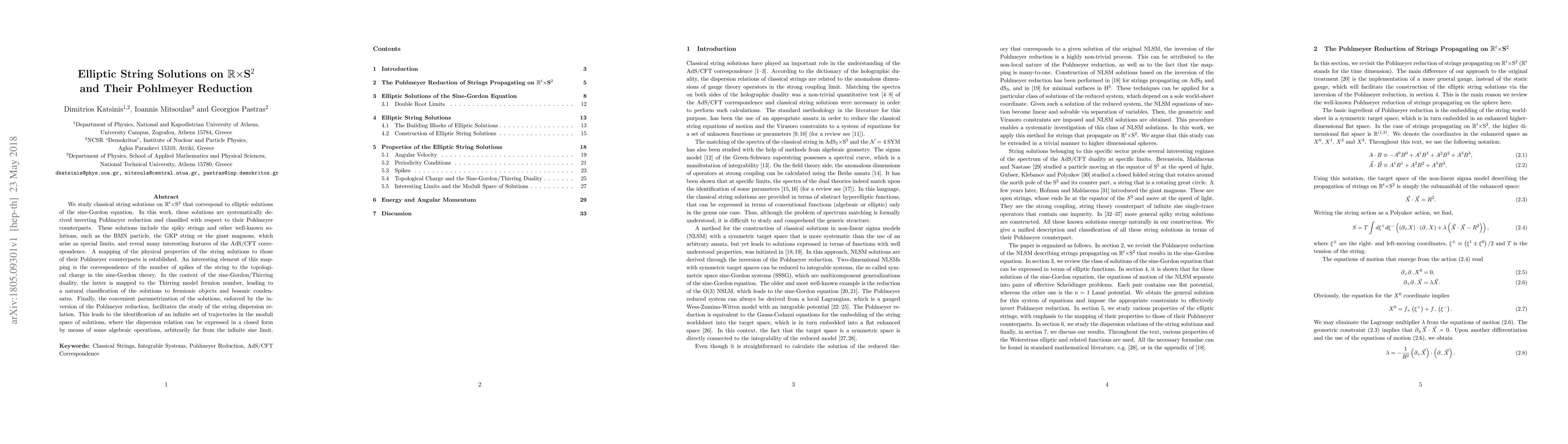 We study classical string solutions on RxS^2 that correspond to elliptic solutions of the sine-Gordon equation. In this work, these solutions are systematically derived inverting Pohlmeyer reduction and classified with respect to their Pohlmeyer counterparts. These solutions include the spiky strings and other well-known solutions, such as the BMN particle, the GKP string or the giant magnons, which arise as special limits, and reveal many interesting features of the AdS/CFT correspondence. A mapping of the physical properties of the string solutions to those of their Pohlmeyer counterparts is established. An interesting element of this mapping is the correspondence of the number of spikes of the string to the topological charge in the sine-Gordon theory. In the context of the sine-Gordon/Thirring duality, the latter is mapped to the Thirring model fermion number, leading to a natural classification of the solutions to fermionic objects and bosonic condensates. Finally, the convenient parametrization of the solutions, enforced by the inversion of the Pohlmeyer reduction, facilitates the study of the string dispersion relation. This leads to the identification of an infinite set of trajectories in the moduli space of solutions, where the dispersion relation can be expressed in a closed form by means of some algebraic operations, arbitrarily far from the infinite size limit.