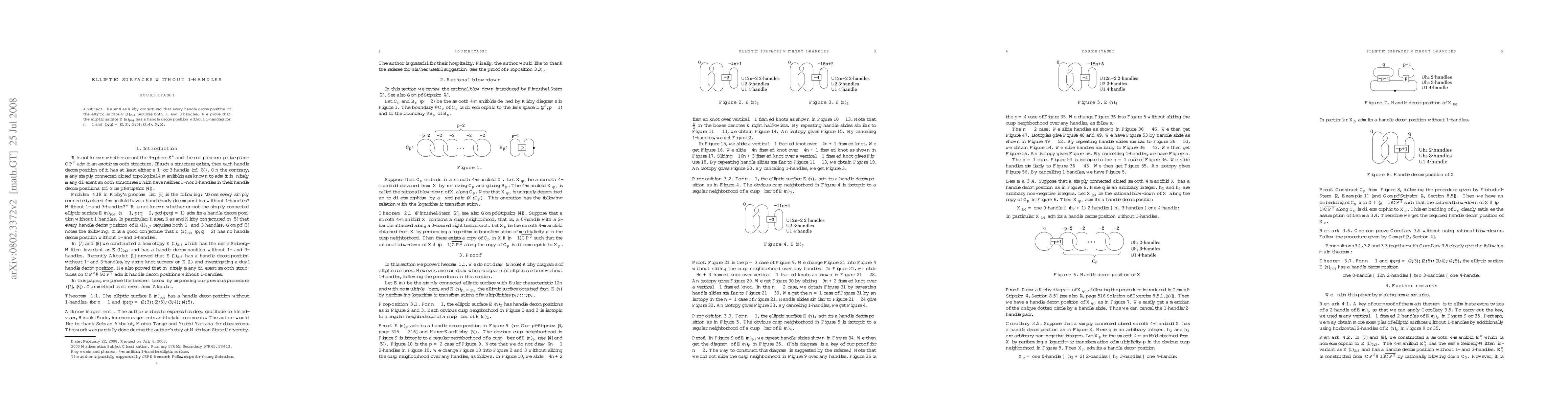 The paper proves that elliptic surfaces E(n)_{p,q} for specific values of n, p, and q can be decomposed into handles without requiring 1-handles, contradicting the Harer-Kas-Kirby conjecture for these particular configurations. This finding expands the understanding of handle decompositions in elliptic surfaces.