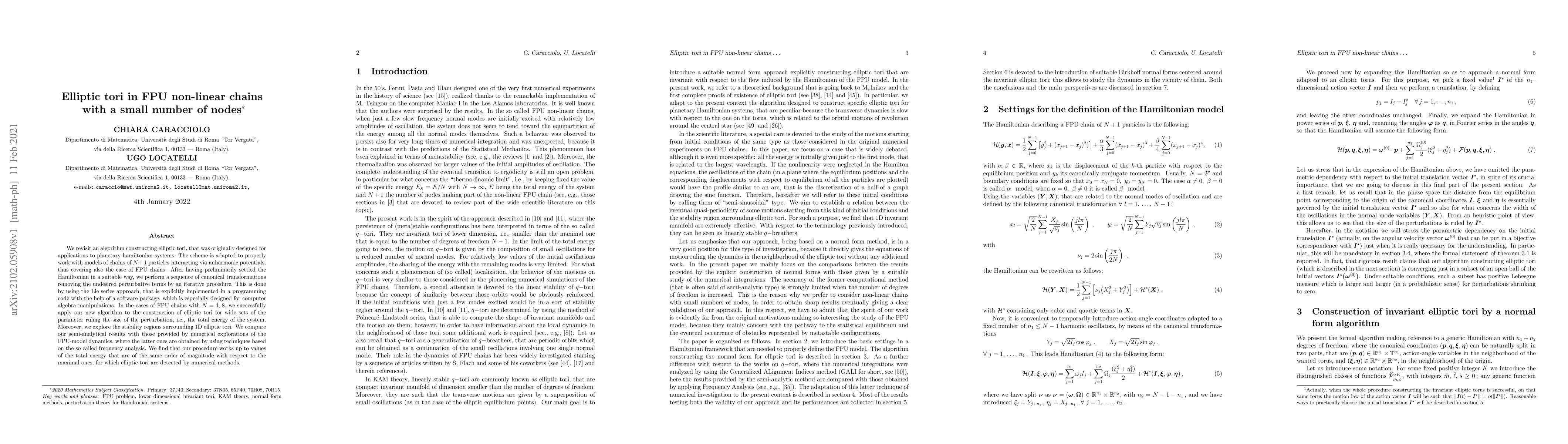 Researchers developed a method to construct elliptic tori in FPU non-linear chains with a small number of nodes, using canonical transformations and the Lie series approach, and found stable regions surrounding 1D elliptic tori that match numerical explorations.