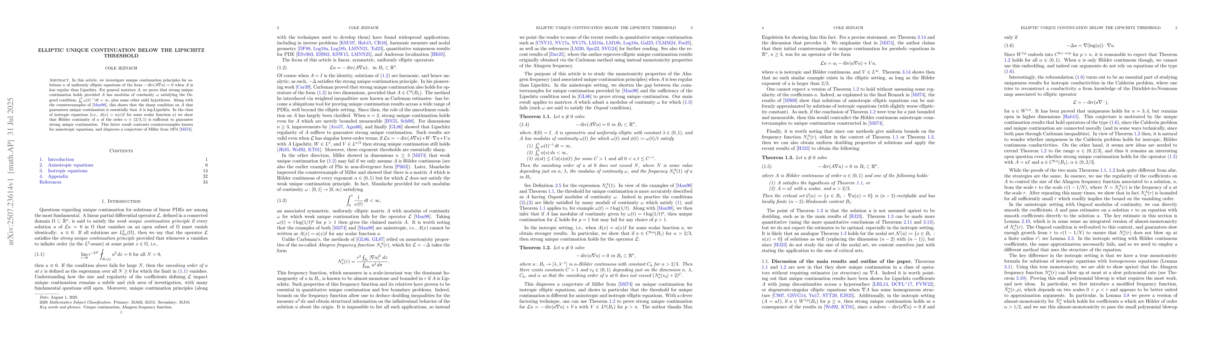 This research paper explores unique continuation principles for elliptic equations with less regular matrices A than previously studied, showing strong unique continuation when A's modulus of continuity meets the Osgood condition. For isotropic equations, the paper proves that Hölder continuity of order (2/3, 1) for the scalar function a guarantees unique continuation, contrasting anisotropic equation counterexamples and disproving a 1974 conjecture by Miller.