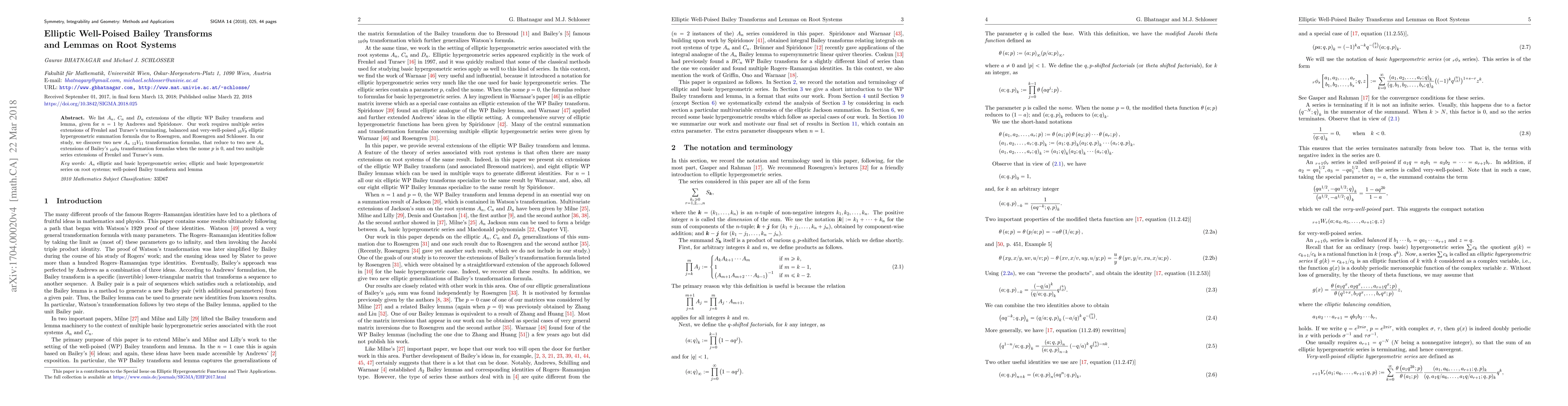 This paper extends elliptic well-poised Bailey transforms and lemmas for root systems $A_n$, $C_n$, and $D_n$, utilizing multiple series extensions of Frenkel and Turaev's elliptic hypergeometric summation formula. It introduces two new $A_n$ ${}_{12}V_{11}$ transformation formulas and their reductions to $A_n$ extensions of Bailey's $_{10}\phi_9$ transformation formulas.
