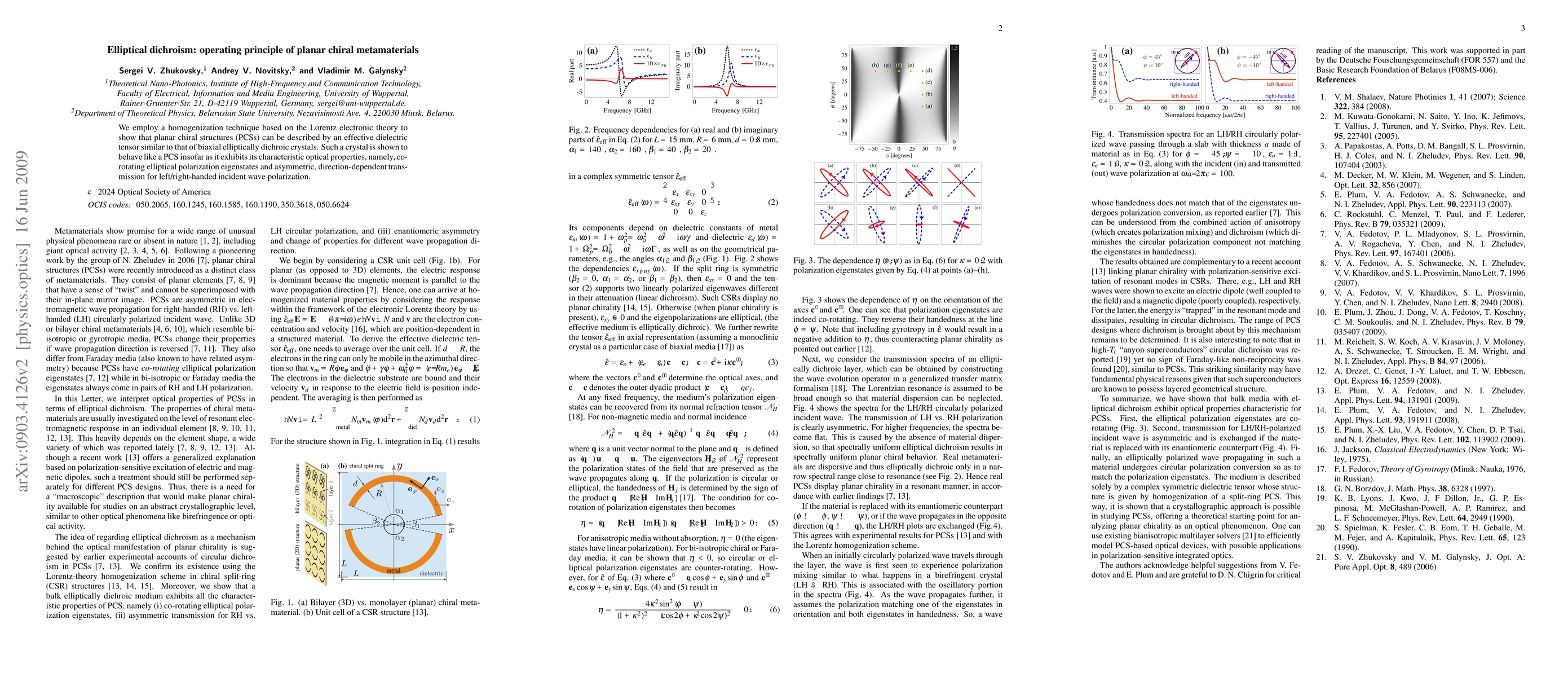 This paper demonstrates that planar chiral structures (PCSs) can be modeled using an effective dielectric tensor akin to biaxial elliptically dichroic crystals, revealing their unique optical properties, including co-rotating elliptical polarization eigenstates and asymmetric transmission based on incident wave polarization.