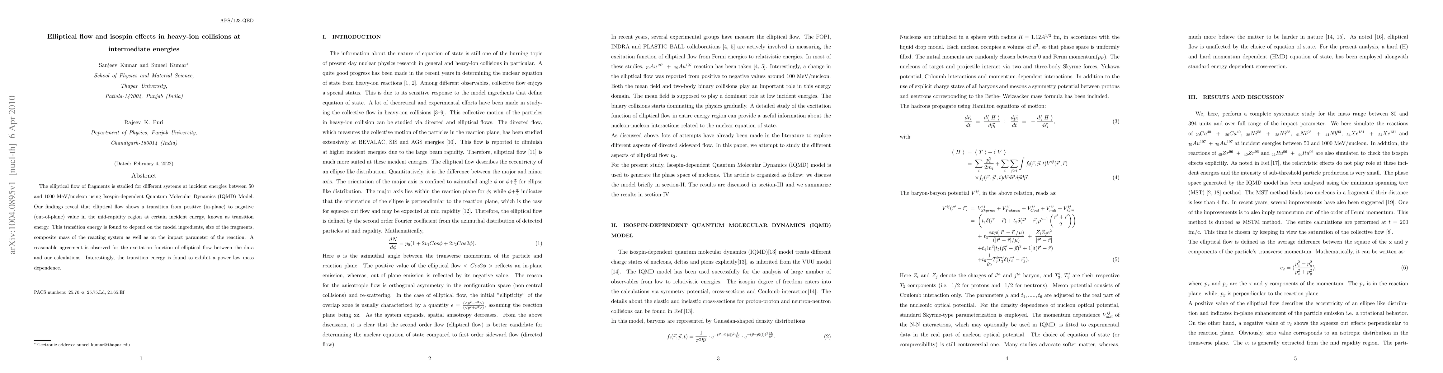This study investigates elliptical flow in heavy-ion collisions at intermediate energies using the IQMD model, revealing a transition from in-plane to out-of-plane flow at a specific energy, termed the transition energy, which varies with system size, fragment mass, and reaction impact parameter. The transition energy shows a power-law mass dependence.