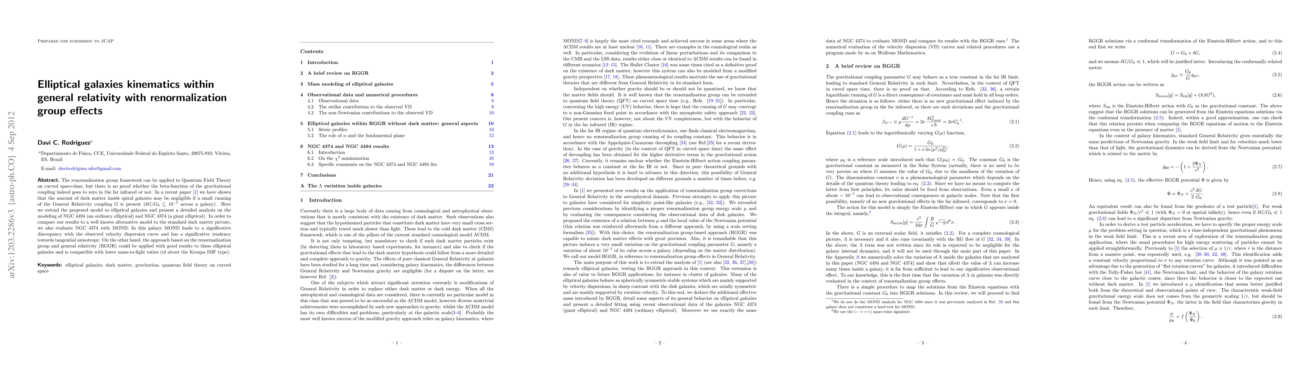 The renormalization group framework can be applied to Quantum Field Theory on curved space-time, but there is no proof whether the beta-function of the gravitational coupling indeed goes to zero in the far infrared or not. In a recent paper we have shown that the amount of dark matter inside spiral galaxies may be negligible if a small running of the General Relativity coupling G is present. Here we extend the proposed model to elliptical galaxies and present a detailed analysis on the modeling of NGC 4494 (an ordinary elliptical) and NGC 4374 (a giant elliptical). In order to compare our results to a well known alternative model to the standard dark matter picture, we also evaluate NGC 4374 with MOND. In this galaxy MOND leads to a significative discrepancy with the observed velocity dispersion curve and has a significative tendency towards tangential anisotropy. On the other hand, the approach based on the renormalization group and general relativity (RGGR) could be applied with good results to these elliptical galaxies and is compatible with lower mass-to-light ratios (of about the Kroupa IMF type).