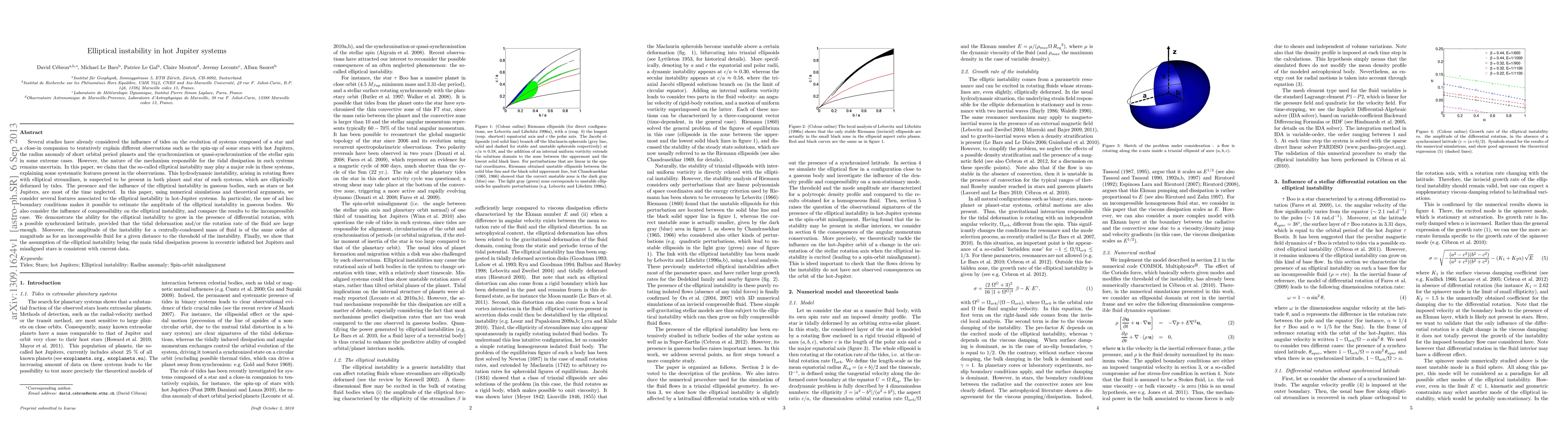 Several studies have already considered the influence of tides on the evolution of systems composed of a star and a close-in companion to tentatively explain different observations such as the spin-up of some stars with hot Jupiters, the radius anomaly of short orbital period planets and the synchronization or quasi-synchronization of the stellar spin in some extreme cases. However, the nature of the mechanism responsible for the tidal dissipation in such systems remains uncertain. In this paper, we claim that the so-called elliptical instability may play a major role in these systems, explaining some systematic features present in the observations. This hydrodynamic instability, arising in rotating flows with elliptical streamlines, is suspected to be present in both planet and star of such systems, which are elliptically deformed by tides. The presence and the influence of the elliptical instability in gaseous bodies, such as stars or hot Jupiters, are most of the time neglected. In this paper, using numerical simulations and theoretical arguments, we consider several features associated to the elliptical instability in hot-Jupiter systems. In particular, the use of ad hoc boundary conditions makes it possible to estimate the amplitude of the elliptical instability in gaseous bodies. We also consider the influence of compressibility on the elliptical instability, and compare the results to the incompressible case. We demonstrate the ability for the elliptical instability to grow in the presence of differential rotation, with a possible synchronized latitude, provided that the tidal deformation and/or the rotation rate of the fluid are large enough. Moreover, the amplitude of the instability for a centrally-condensed mass of fluid is of the same order of magnitude as for an incompressible fluid for a given distance to the threshold of the instability. Finally, we show that the assumption of the elliptical instability being the main tidal dissipation process in eccentric inflated hot Jupiters and misaligned stars is consistent with current data.