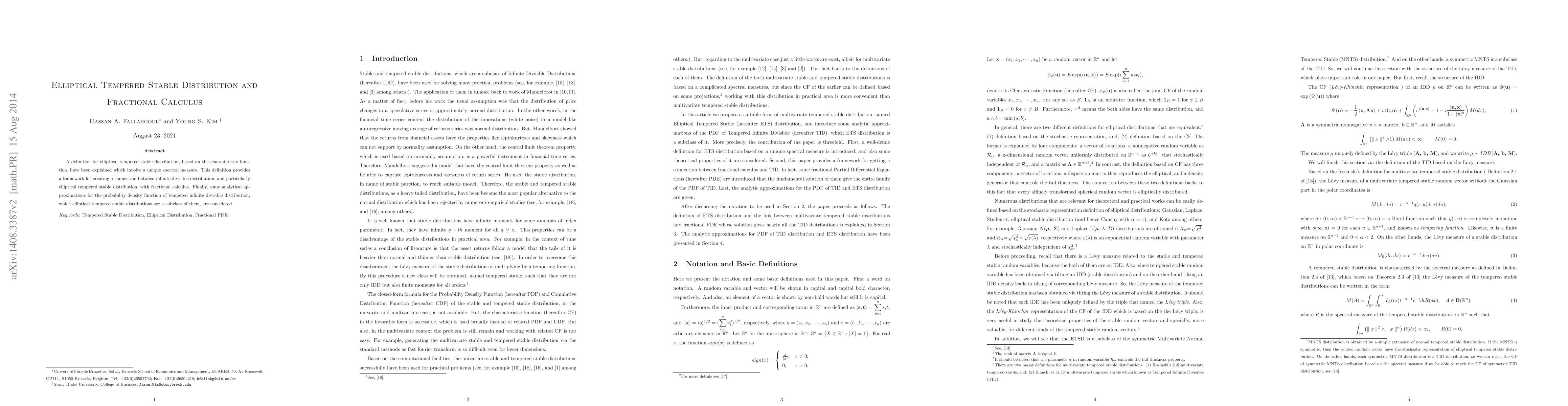 A definition for elliptical tempered stable distribution, based on the characteristic function, have been explained which involve a unique spectral measure. This definition provides a framework for creating a connection between infinite divisible distribution, and particularly elliptical tempered stable distribution, with fractional calculus. Finally, some analytical approximations for the probability density function of tempered infinite divisible distribution, which elliptical tempered stable distributions are a subclass of them, are considered.