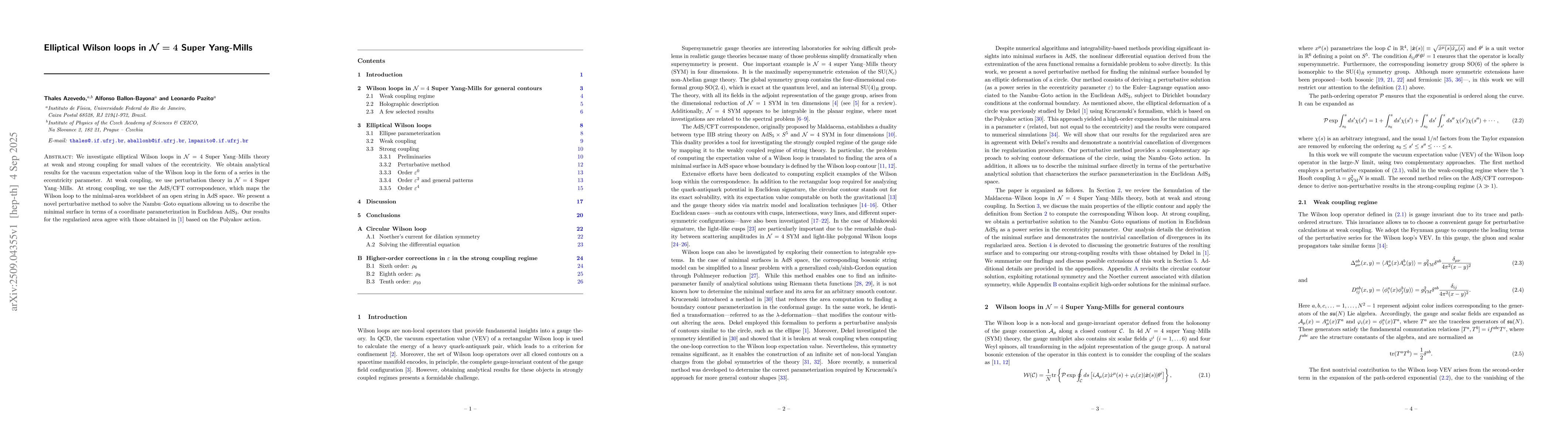 We investigate elliptical Wilson loops in ${\cal N}=4$ Super Yang--Mills theory at weak and strong coupling for small values of the eccentricity. We obtain analytical results for the vacuum expectation value of the Wilson loop in the form of a series in the eccentricity parameter. At weak coupling, we use perturbation theory in ${\cal N}=4$ Super Yang--Mills. At strong coupling, we use the AdS/CFT correspondence, which maps the Wilson loop to the minimal-area worldsheet of an open string in AdS space. We present a novel perturbative method to solve the Nambu--Goto equations allowing us to describe the minimal surface in terms of a coordinate parameterization in Euclidean AdS$_3$. Our results for the regularized area agree with those obtained by Dekel in [1] based on the Polyakov action.