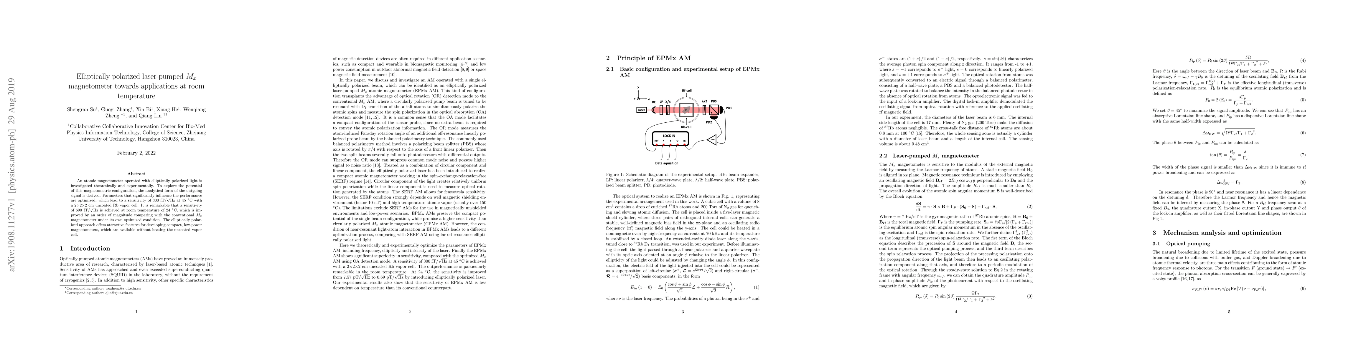 An atomic magnetometer operated with elliptically polarized light is investigated theoretically and experimentally. To explore the potential of this magnetometric configuration, the analytical form of the outgoing signal is derived. Parameters that significantly influence the performance are optimized, which lead to a sensitivity of 300 $\rm fT/\sqrt{Hz}$ at 45 $^{\circ}$C with a 2$\times$2$\times2$ cm uncoated Rb vapor cell. It is remarkable that a sensitivity of 690 $\rm fT/\sqrt{Hz}$ is achieved at room temperature of 24 $^{\circ}$C, which is improved by an order of magnitude compared with the conventional $M_x$ magnetometer under its own optimized condition. The elliptically polarized approach offers attractive features for developing compact, low-power magnetometers, which are available without heating the uncoated vapor cell.