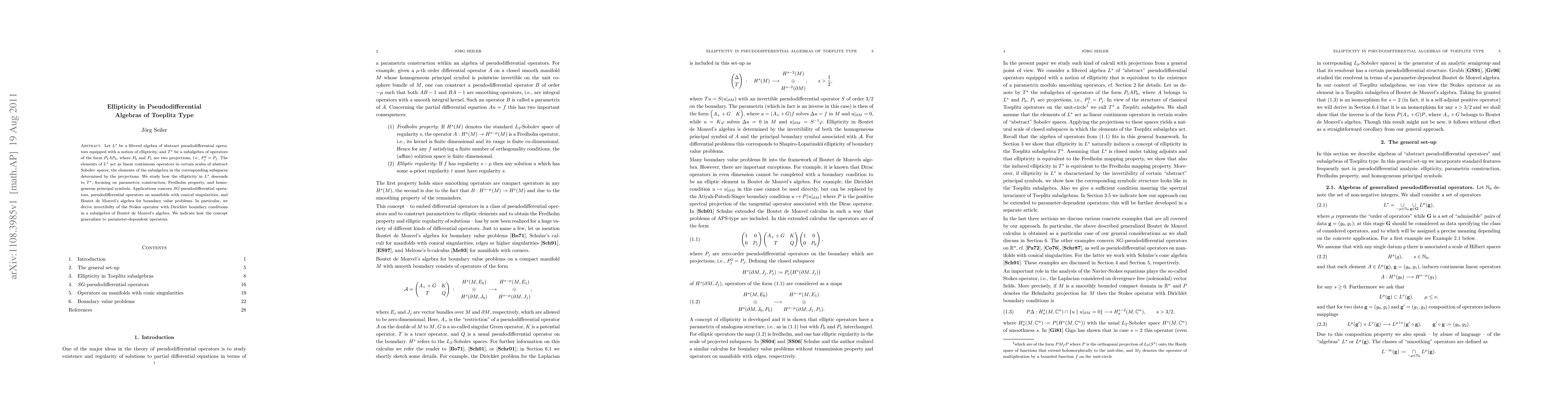 Let L^\star be a filtered algebra of abstract pseudodifferential operators equipped with a notion of ellipticity, and T^\star be a subalgebra of operators of the form P_1AP_0, where P_0 and P_1 are two projections. The elements of L^\star act as linear continuous operators in certain scales of abstract Sobolev spaces, the elements of the subalgebra in the corresponding subspaces determined by the projections. We study how the ellipticity in L^\star descends to T^\star, focusing on parametrix construction, Fredholm property, and homogeneous principal symbols. Applications concern SG-pseudodifferential operators, pseudodifferential operators on manifolds with conical singularities, and Boutet de Monvel's algebra for boundary value problems. In particular, we derive invertibilty of the Stokes operator with Dirichlet boundary conditions in a subalgebra of Boutet de Monvel's algebra. We indicate how the concept generalizes to parameter-dependent operators.