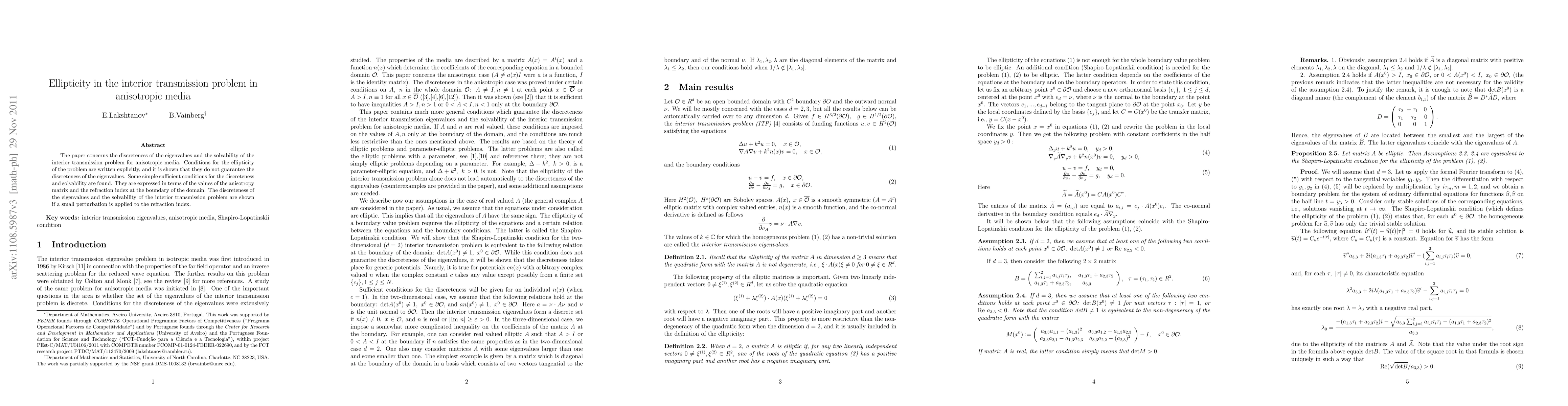 This paper investigates the interior transmission problem in anisotropic media, focusing on the discreteness of eigenvalues and solvability conditions. It explicitly defines ellipticity conditions that do not ensure discrete eigenvalues, and provides simple sufficient conditions for both discreteness and solvability based on anisotropy matrix and boundary refraction index values.