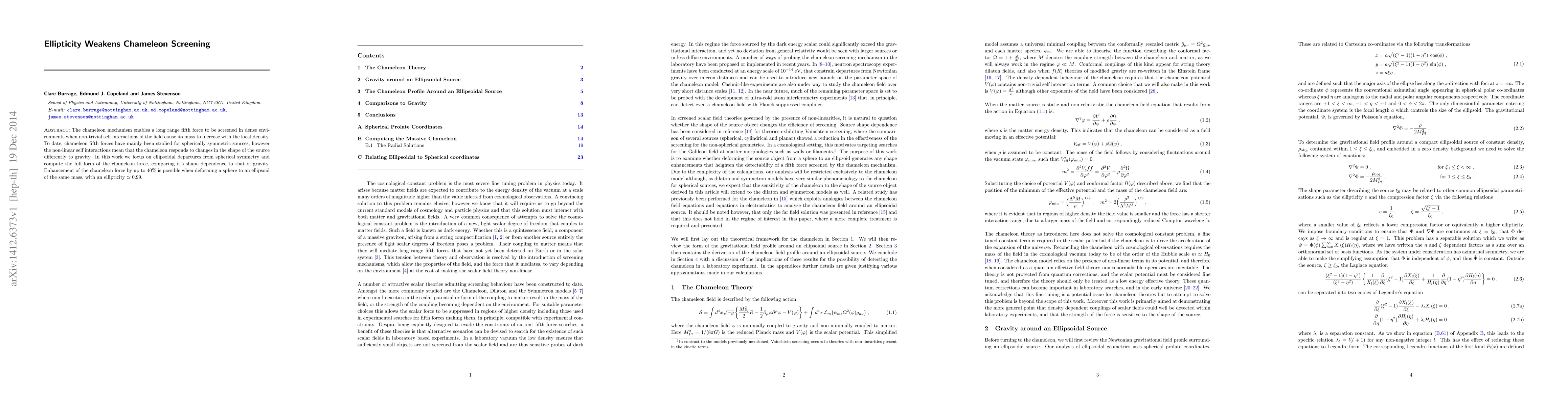 This paper investigates how the chameleon mechanism's screening effect is weakened when the source shape deviates from spherical symmetry, specifically for ellipsoidal shapes. It finds that the chameleon force can be enhanced by up to 40% when the ellipticity is around 0.99, indicating that shape changes significantly affect the chameleon's response compared to gravity.