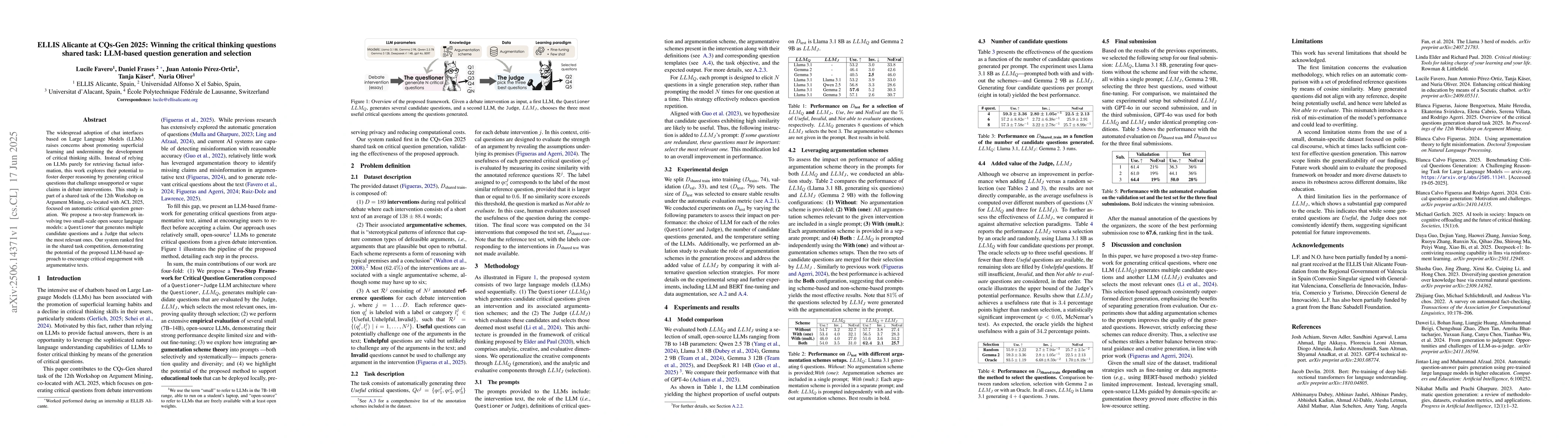 The widespread adoption of chat interfaces based on Large Language Models (LLMs) raises concerns about promoting superficial learning and undermining the development of critical thinking skills. Instead of relying on LLMs purely for retrieving factual information, this work explores their potential to foster deeper reasoning by generating critical questions that challenge unsupported or vague claims in debate interventions. This study is part of a shared task of the 12th Workshop on Argument Mining, co-located with ACL 2025, focused on automatic critical question generation. We propose a two-step framework involving two small-scale open source language models: a Questioner that generates multiple candidate questions and a Judge that selects the most relevant ones. Our system ranked first in the shared task competition, demonstrating the potential of the proposed LLM-based approach to encourage critical engagement with argumentative texts.