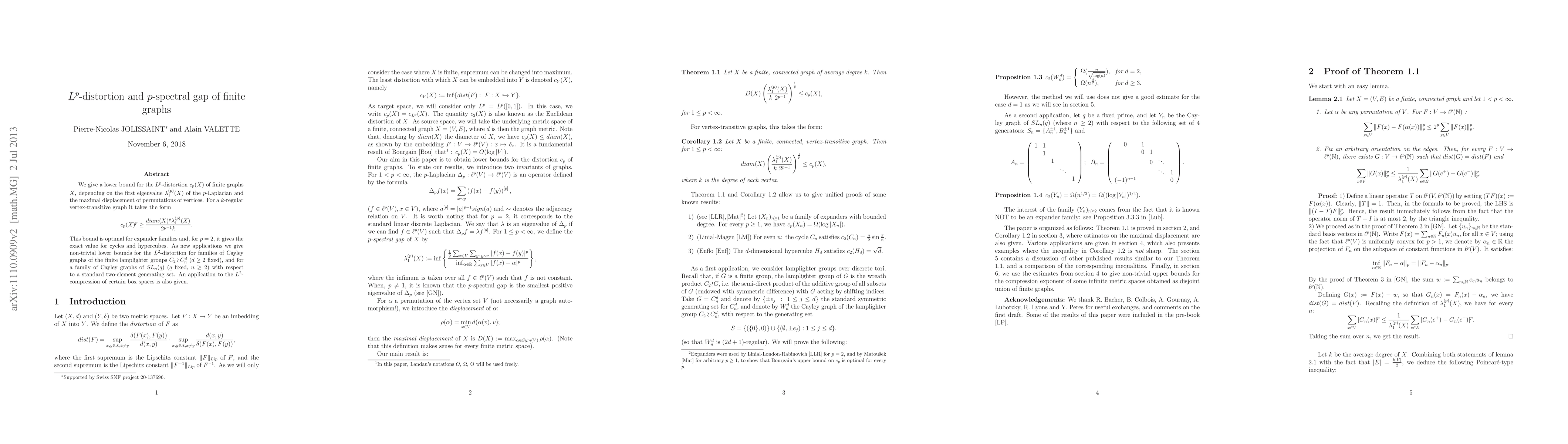 We give a lower bound for the $\ell^p$-distortion $c_p(X)$ of finite graphs $X$, depending on the first eigenvalue $\lambda_1^{(p)}(X)$ of the $p$-Laplacian and the maximal displacement of permutations of vertices. For a $k$-regular vertex-transitive graph it takes the form $c_p(X)^{p}\geq diam(X)^{p}\lambda_{1}^{(p)}(X)/2^{p-1}k$. This bound is optimal for expander families and, for $p=2$, it gives the exact value for cycles and hypercubes. As a new application we give a non-trivial lower bound for the $\ell^2$-distortion of a family of Cayley graphs of $SL_n(q)$ ($q$ fixed, $n\geq 2$) with respect to a standard two-element generating set.