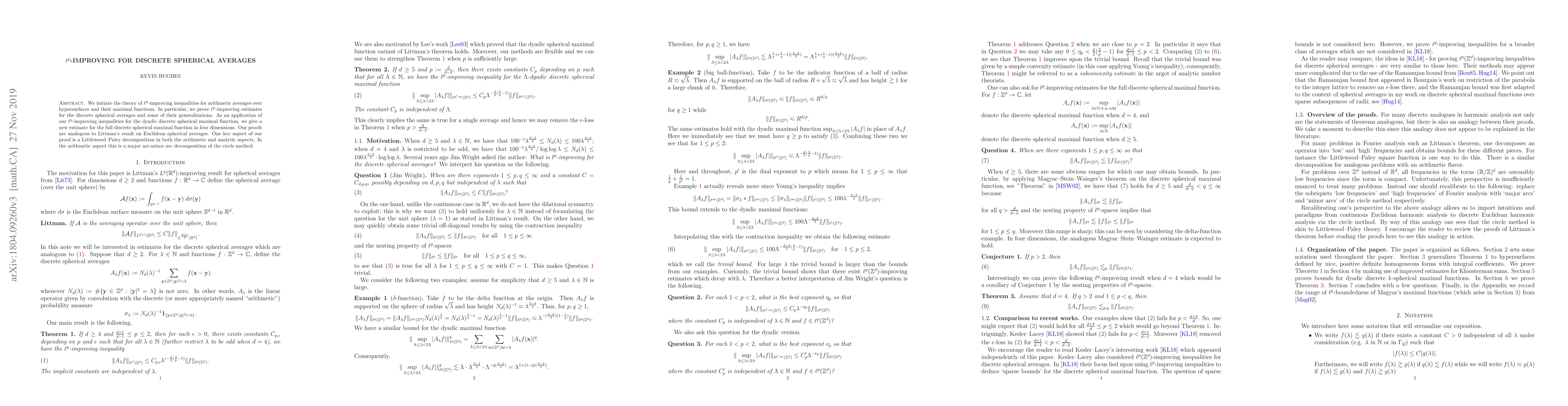 We initiate the theory of $\ell^p$-improving inequalities for arithmetic averages over hypersurfaces and their maximal functions. In particular, we prove $\ell^p$-improving estimates for the discrete spherical averages and some of their generalizations. As an application of our $\ell^p$-improving inequalities for the dyadic discrete spherical maximal function, we give a new estimate for the full discrete spherical maximal function in four dimensions. Our proofs are analogous to Littman's result on Euclidean spherical averages. One key aspect of our proof is a Littlewood--Paley decomposition in both the arithmetic and analytic aspects. In the arithmetic aspect this is a major arc-minor arc decomposition of the circle method.