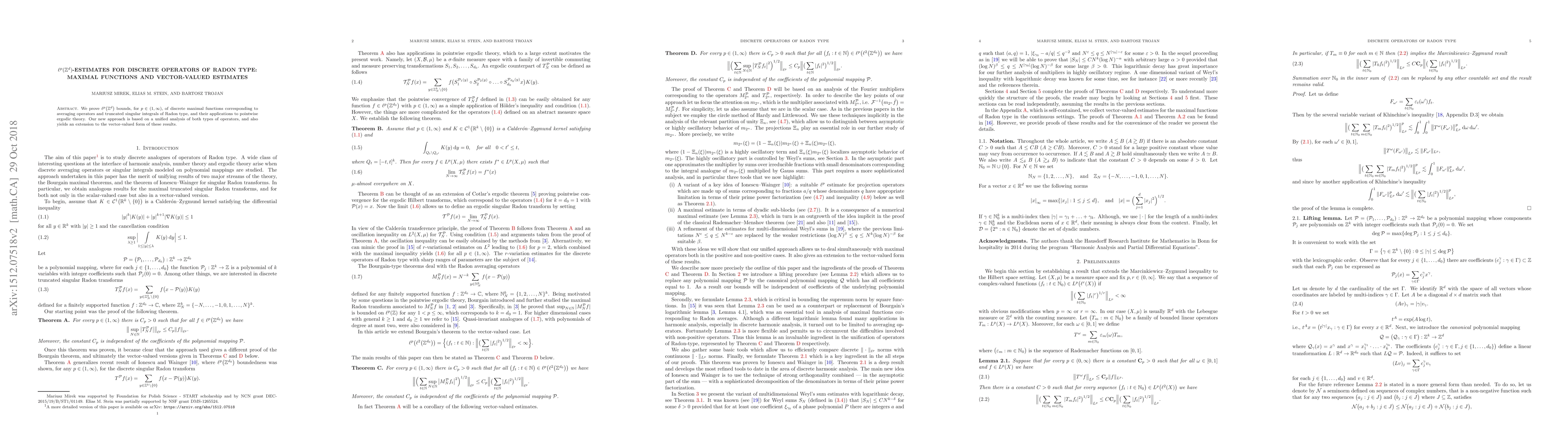 This paper establishes $\ell^p\big(\mathbb Z^d\big)$ bounds for discrete maximal functions associated with Radon type operators, including averaging operators and truncated singular integrals. The unified analysis also extends these results to vector-valued forms, with applications in pointwise ergodic theory.