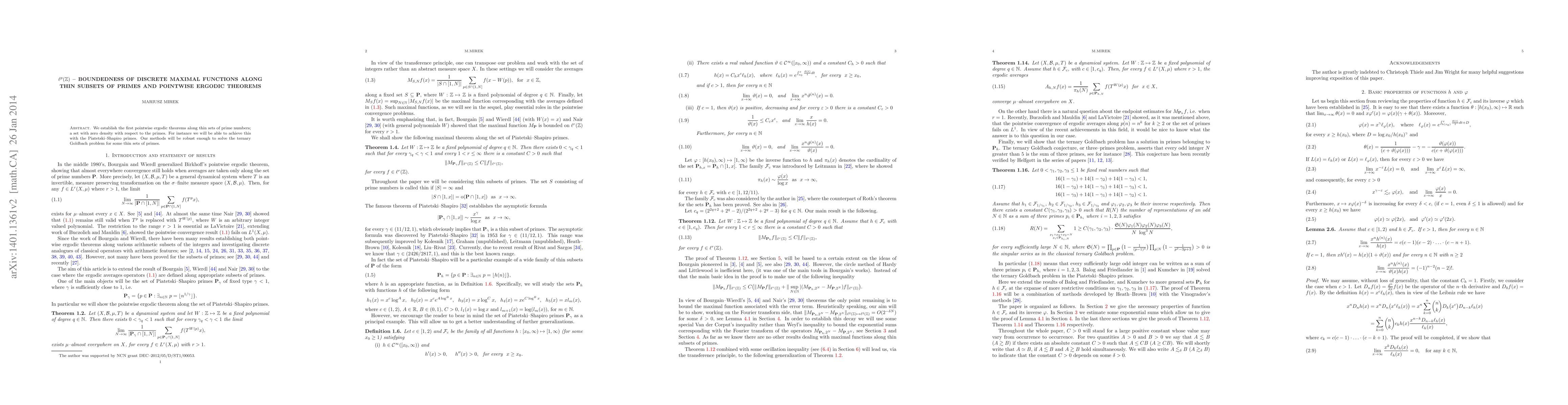 Summary: This paper establishes the first pointwise ergodic theorems for discrete maximal functions along thin sets of prime numbers, including Piatetski-Shapiro primes, and demonstrates the robustness of these methods by solving the ternary Goldbach problem for certain prime subsets.