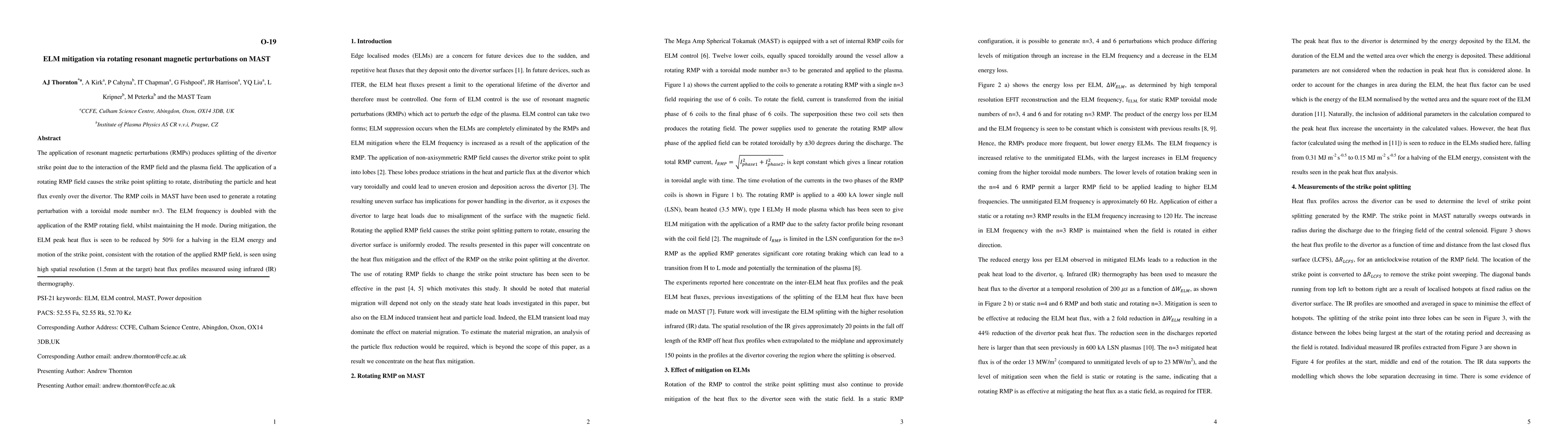 This paper investigates the use of rotating resonant magnetic perturbations (RMPs) on MAST to mitigate edge-localized modes (ELMs). The rotating RMP field doubles the ELM frequency while maintaining H mode, reducing peak heat flux by 50% and distributing particle and heat flux evenly across the divertor, as confirmed by high-resolution infrared thermography.