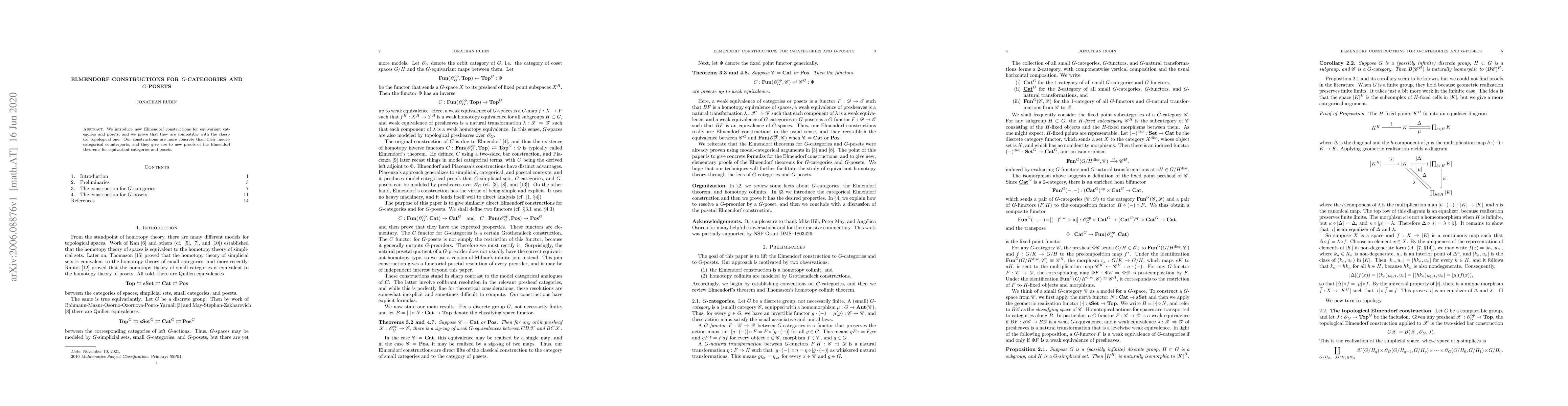 This paper introduces new, concrete Elmendorf constructions for equivariant categories and posets, which are shown to be compatible with the classical topological constructions. The new constructions provide fresh proofs for the Elmendorf theorems in these contexts.