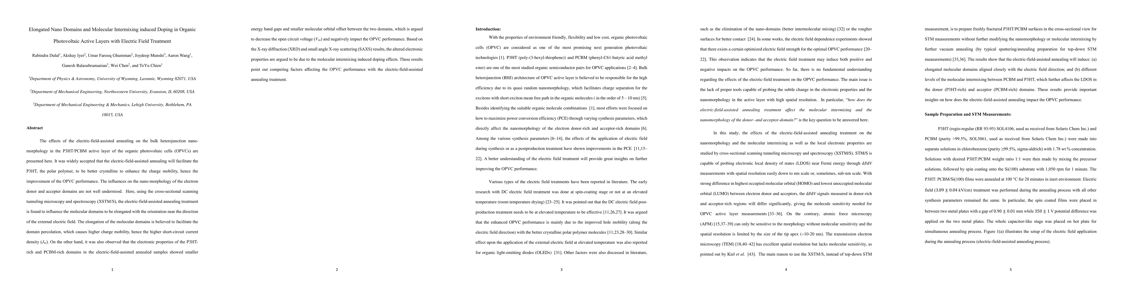 Electric-field-assisted annealing treatment elongates molecular domains in organic photovoltaic active layers, improving charge mobility but decreasing open-circuit voltage due to intermixing-induced doping effects.