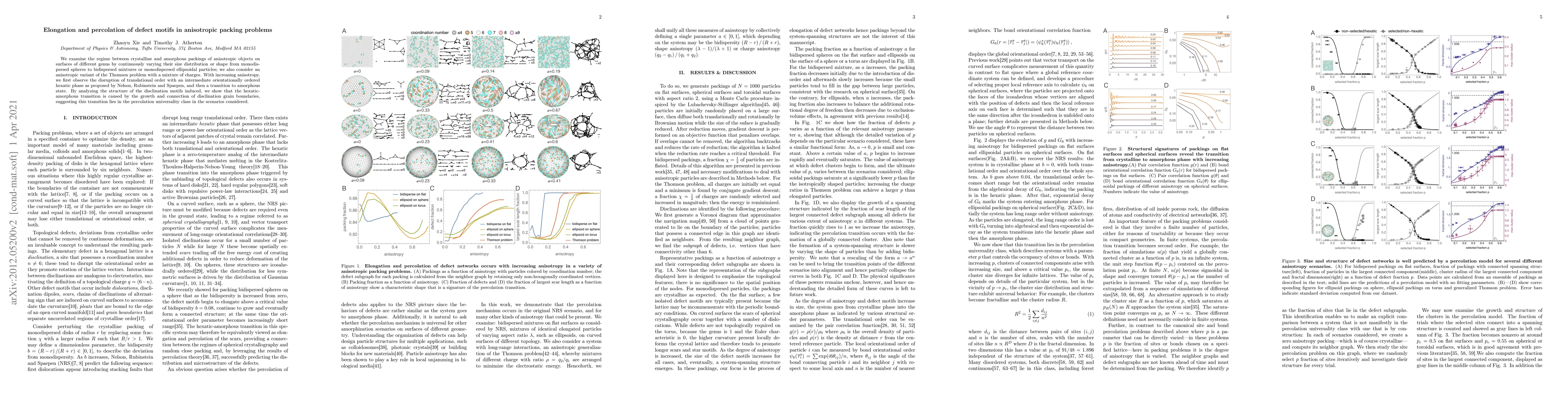 We examine the regime between crystalline and amorphous packings of anisotropic objects on surfaces of different genus by continuously varying their size distribution or shape from monodispersed spheres to bidispersed mixtures or monodispersed ellipsoidal particles; we also consider an anisotropic variant of the Thomson problem with a mixture of charges. With increasing anisotropy, we first observe the disruption of translational order with an intermediate orientationally ordered hexatic phase as proposed by Nelson, Rubinstein and Spaepen, and then a transition to amorphous state. By analyzing the structure of the disclination motifs induced, we show that the hexatic-amorphous transition is caused by the growth and connection of disclination grain boundaries, suggesting this transition lies in the percolation universality class in the scenarios considered.