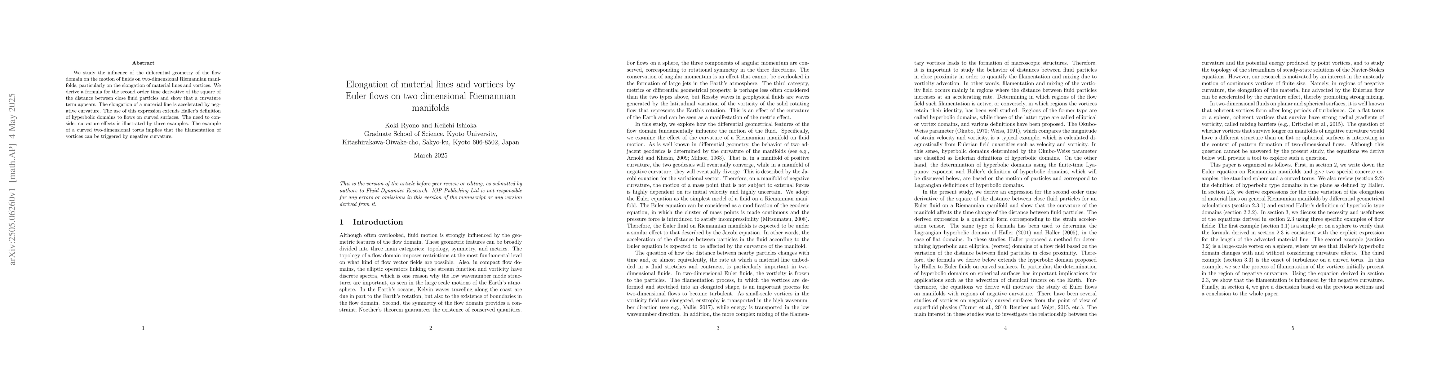 Researchers study how fluids on curved surfaces elongate material lines and vortices, discovering that negative curvature accelerates line elongation and can even trigger vortex filamentation.