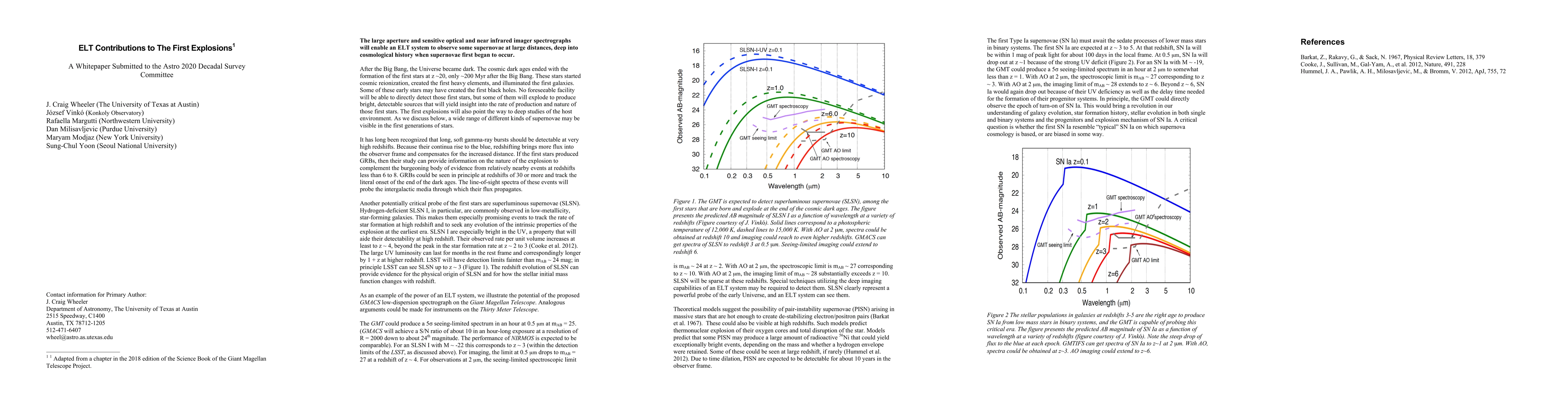 The large aperture and sensitive optical and near infrared imager spectrographs will enable an ELT system to observe some supernovae at large distances, deep into cosmological history when supernovae first began to occur.