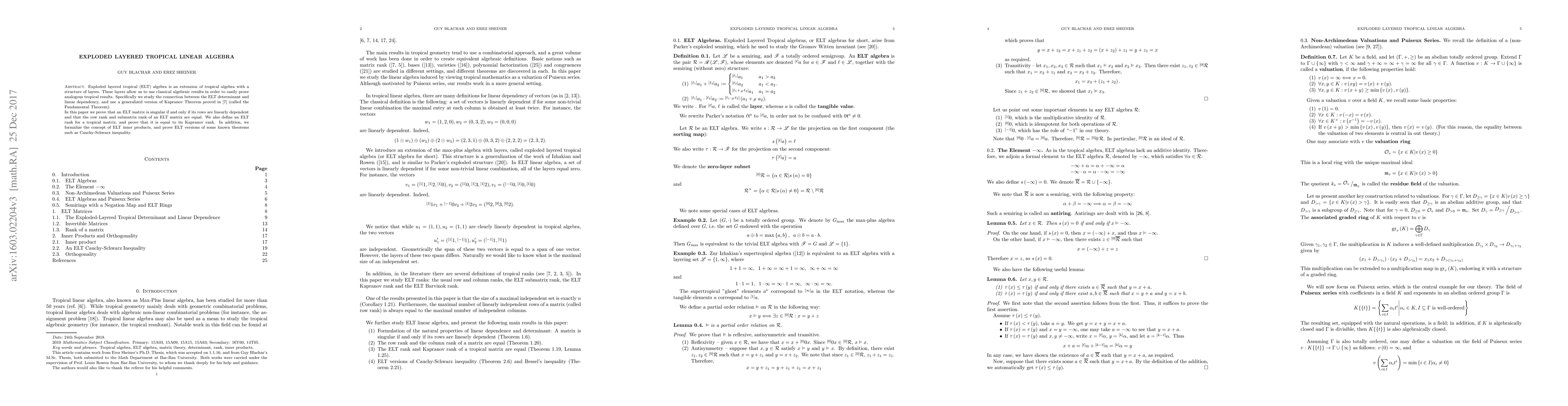 Exploded layered tropical (ELT) algebra is an extension of tropical algebra with a structure of layers. These layers allow us to use classical algebraic results in order to easily prove analogous tropical results. Specifically we study the connection between the ELT determinant and linear dependency, and use a generalized version of Kapranov Theorem proved in [7] (called the Fundamental Theorem). In this paper we prove that an ELT matrix is singular if and only if its rows are linearly dependent and that the row rank and submatrix rank of an ELT matrix are equal. We also define an ELT rank for a tropical matrix, and prove that it is equal to its Kapranov rank. In addition, we formalize the concept of ELT inner products, and prove ELT versions of some known theorems such as Cauchy-Schwarz inequality.