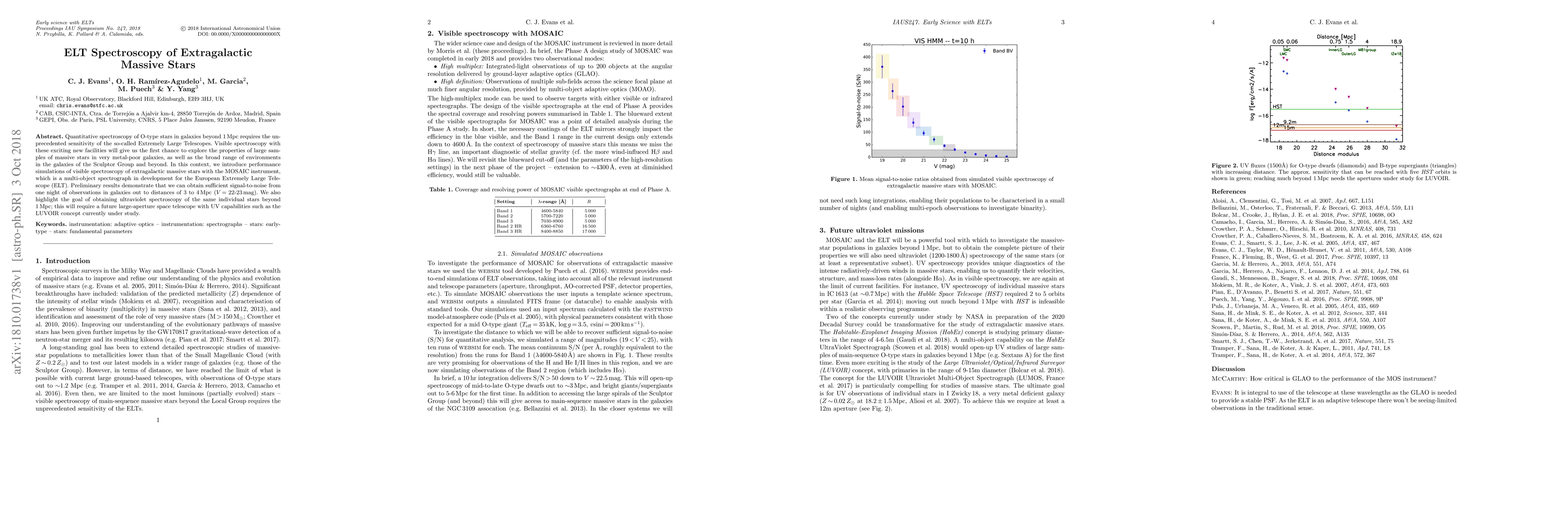 Quantitative spectroscopy of O-type stars in galaxies beyond 1 Mpc requires the unprecedented sensitivity of the so-called Extremely Large Telescopes. Visible spectroscopy with these exciting new facilities will give us the first chance to explore the properties of large samples of massive stars in very metal-poor galaxies, as well as the broad range of environments in the galaxies of the Sculptor Group and beyond. In this context, we introduce performance simulations of visible spectroscopy of extragalactic massive stars with the MOSAIC instrument, which is a multi-object spectrograph in development for the European Extremely Large Telescope (ELT). Preliminary results demonstrate that we can obtain sufficient signal-to-noise from one night of observations in galaxies out to distances of 3 to 4 Mpc (V = 22-23 mag). We also highlight the goal of obtaining ultraviolet spectroscopy of the same individual stars beyond 1 Mpc; this will require a future large-aperture space telescope with UV capabilities such as the LUVOIR concept currently under study.
