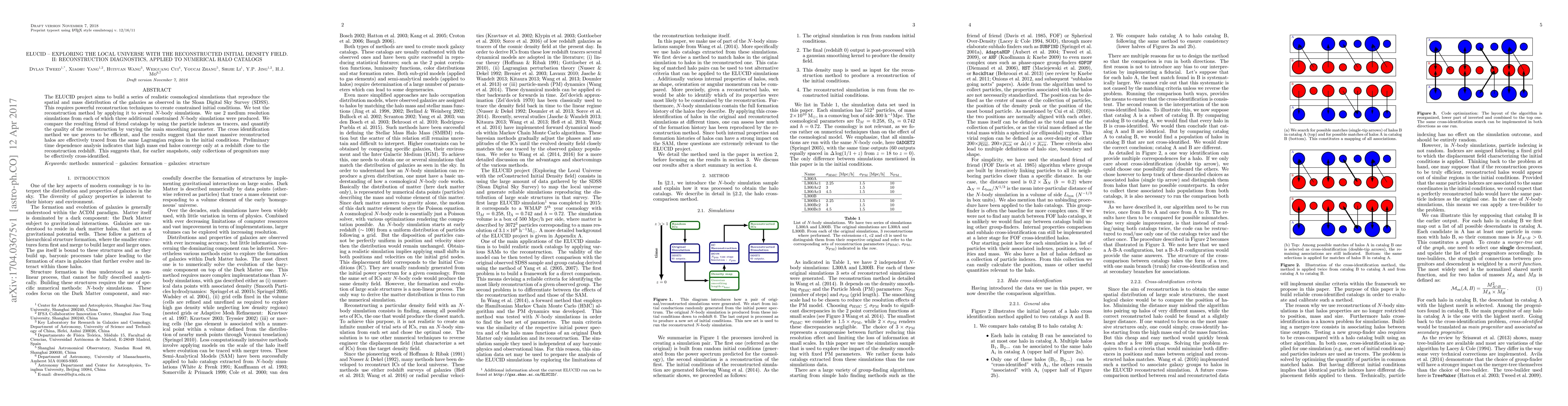 The ELUCID project aims to build a series of realistic cosmological simulations that reproduce the spatial and mass distribution of the galaxies as observed in the Sloan Digital Sky Survey (SDSS). This requires powerful reconstruction techniques to create constrained initial conditions. We test the reconstruction method by applying it to several $N$-body simulations. We use 2 medium resolution simulations from each of which three additional constrained $N$-body simulations were produced. We compare the resulting friend of friend catalogs by using the particle indexes as tracers, and quantify the quality of the reconstruction by varying the main smoothing parameter. The cross identification method we use proves to be efficient, and the results suggest that the most massive reconstructed halos are effectively traced from the same Lagrangian regions in the initial conditions. Preliminary time dependence analysis indicates that high mass end halos converge only at a redshift close to the reconstruction redshift. This suggests that, for earlier snapshots, only collections of progenitors may be effectively cross-identified.