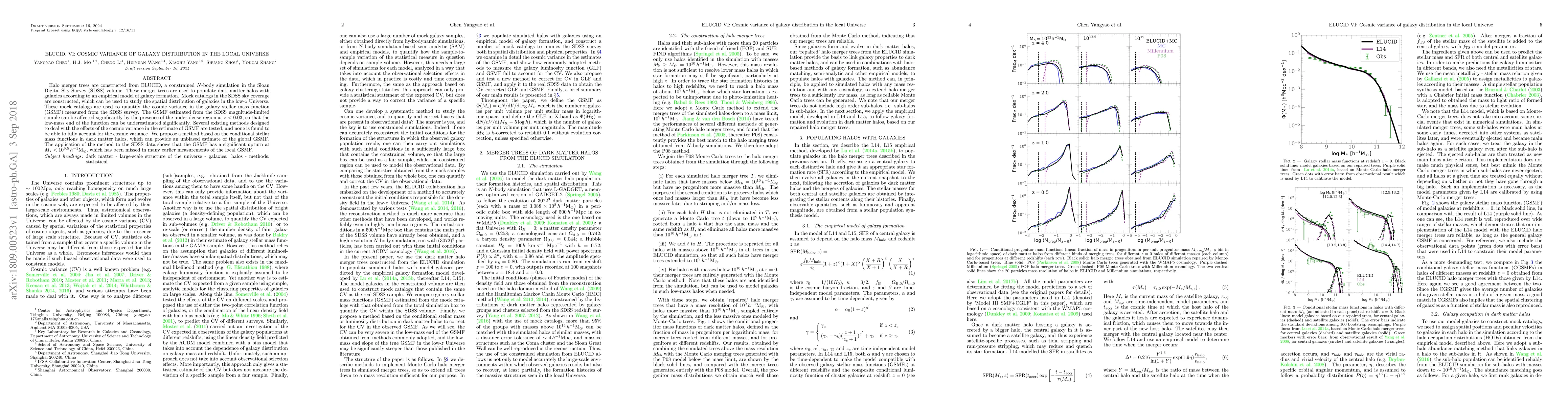 Halo merger trees are constructed from ELUCID, a constrained $N$-body simulation in the Sloan Digital Sky Survey (SDSS) volume. These merger trees are used to populate dark matter halos with galaxies according to an empirical model of galaxy formation. Mock catalogs in the SDSS sky coverage are constructed, which can be used to study the spatial distribution of galaxies in the low-$z$ Universe. These mock catalogs are used to quantify the cosmic variance in the galaxy stellar mass function (GSMF) measured from the SDSS survey. The GSMF estimated from the SDSS magnitude-limited sample can be affected significantly by the presence of the under-dense region at $z<0.03$, so that the low-mass end of the function can be underestimated significantly. Several existing methods designed to deal with the effects of the cosmic variance in the estimate of GSMF are tested, and none is found to be able to fully account for the cosmic variance. We propose a method based on the conditional stellar mass functions in dark matter halos, which can provide an unbiased estimate of the global GSMF. The application of the method to the SDSS data shows that the GSMF has a significant upturn at $M_*< 10^{9.5} h^{-1}{\rm M}_\odot$, which has been missed in many earlier measurements of the local GSMF.