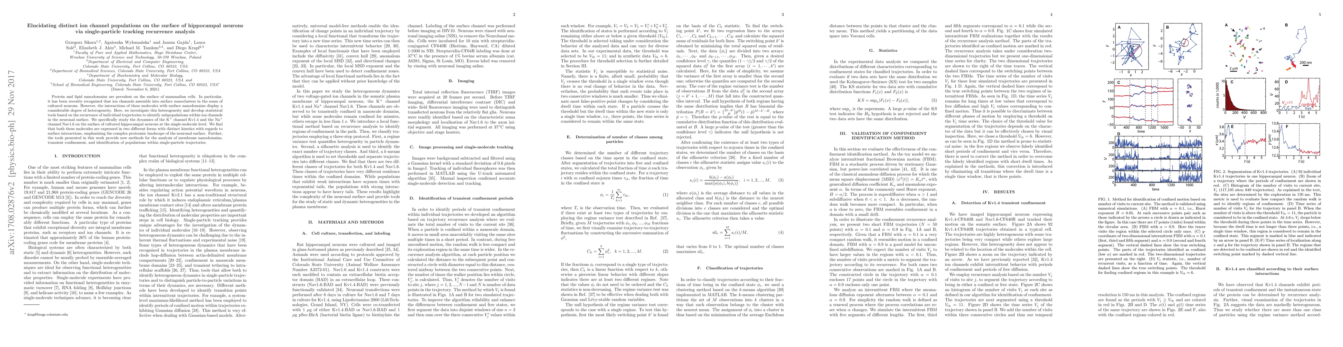 This paper develops statistical tools based on single-particle tracking to identify distinct subpopulations of Kv1.4 and Nav1.6 ion channels on hippocampal neurons, revealing complex surface interactions and heterogeneity in their dynamics. The study highlights the proteomic complexity of the neuronal surface and introduces new methods for analyzing membrane nanodomains.